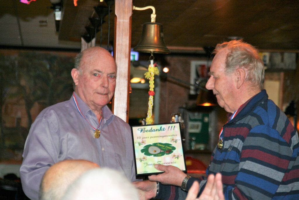Daarna afscheid van penningmeester Jaap Zweeris, die tien jaar lang heeft gezorgd voor een gezonde financiële basis. Hij werd verrast met een boekenbon en een oorkonde. Ook werd even stil gestaan bij de speelwijze van Jaap, gemene balletjes vlak over het net. Helaas moest hij stoppen vanwege een onwillige knie. De penningen zijn nu in handen van Kees Deutekom.