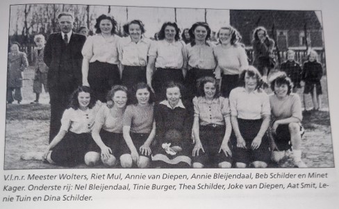 Het tenue van deze vereniging bestond uit een lichtblauwe blouse met 4 witte knopen en donkerblauwe rok. In mei ’45 kwam de bevrijding. De handbalsters van het pas opgerichte Geel-Zwart namen in genoemd kostuumdeel aan de bevrijdingsfeesten.