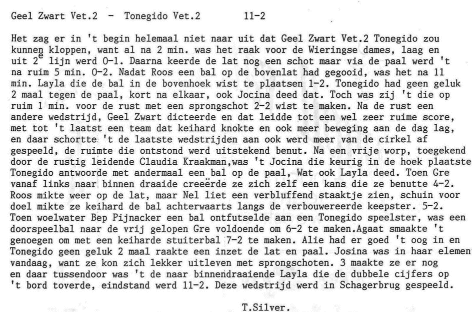 Tijmen heeft vanaf de jaren 70 vele verslagen voor de Sportvriend geschreven van jeugd- en seniorenwedstrijden die hij begeleidde. Onderstaand verslag is van 3 februari 1994 van een wedstrijd van Veteranen 2 waar hij ook jarenlang coach van is geweest.