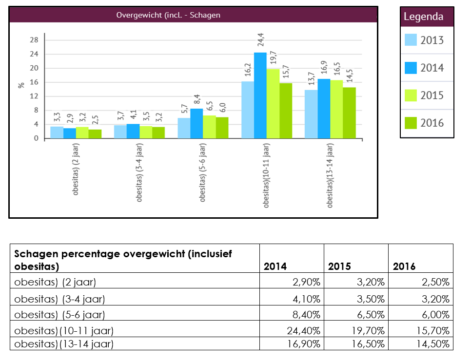 In Schagen ligt het percentage kinderen met overgewicht (inclusief obesitas) lager dan de percentage van Noord-Holland Noord. In de leeftijdsgroep 10-11 jarigen daalde het percentage kinderen met overgewicht (incl. obesitas) van 24,4% naar 15,7%, bij de 3-4 jarigen daalde het percentage van 4,1% naar 3,2%, bij de 5-6 jarigen daalde het percentage van 8,4% naar 6,0% en bij de 13-14 jarigen daalde het percentage van 16,9% naar 14,5%. Bron: gezondheidsatlas GGD Hollands Noorden. Percentage overgewicht (incl. obesitas) gemeente Schagen 2014 t/m 2016.