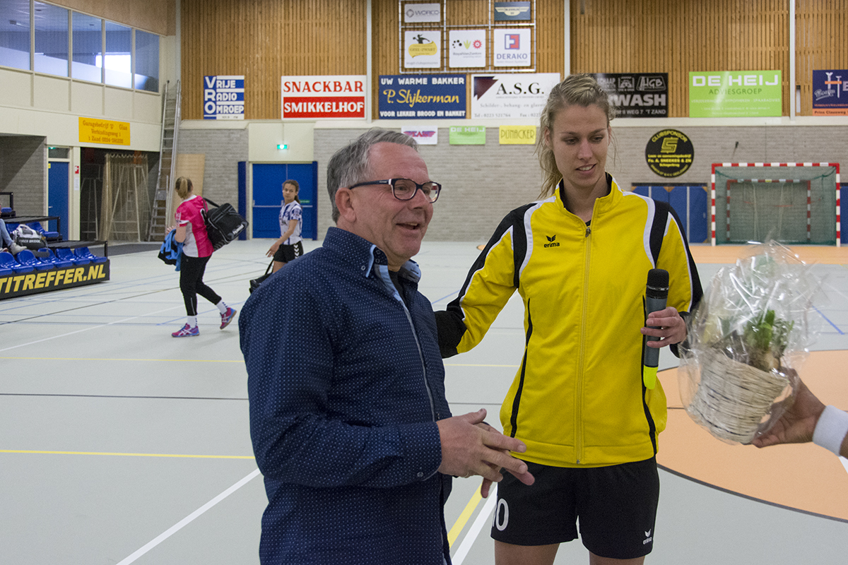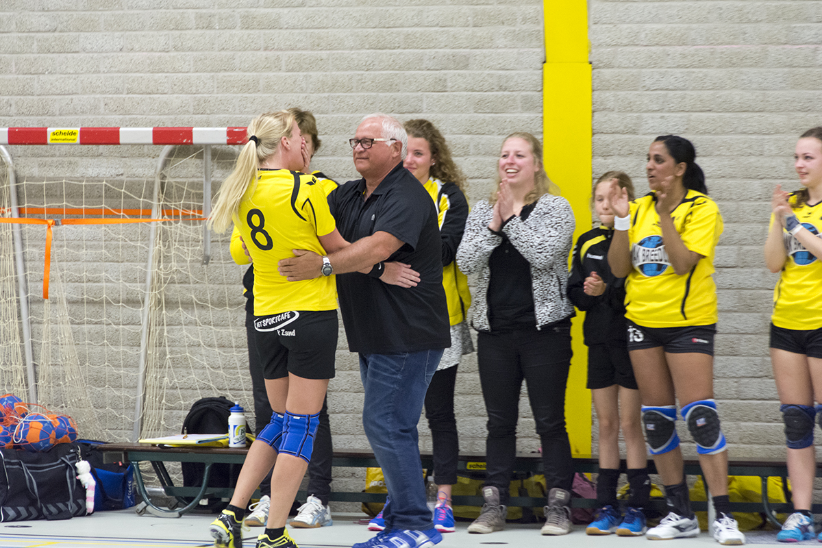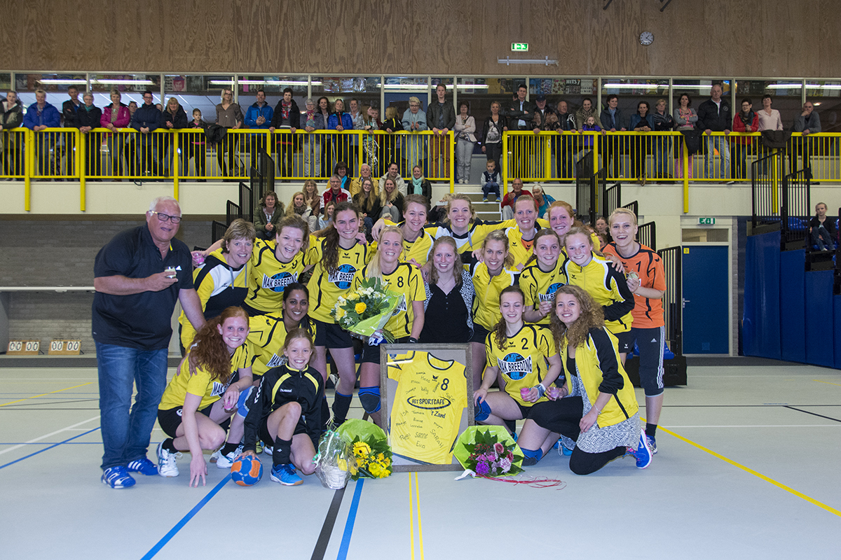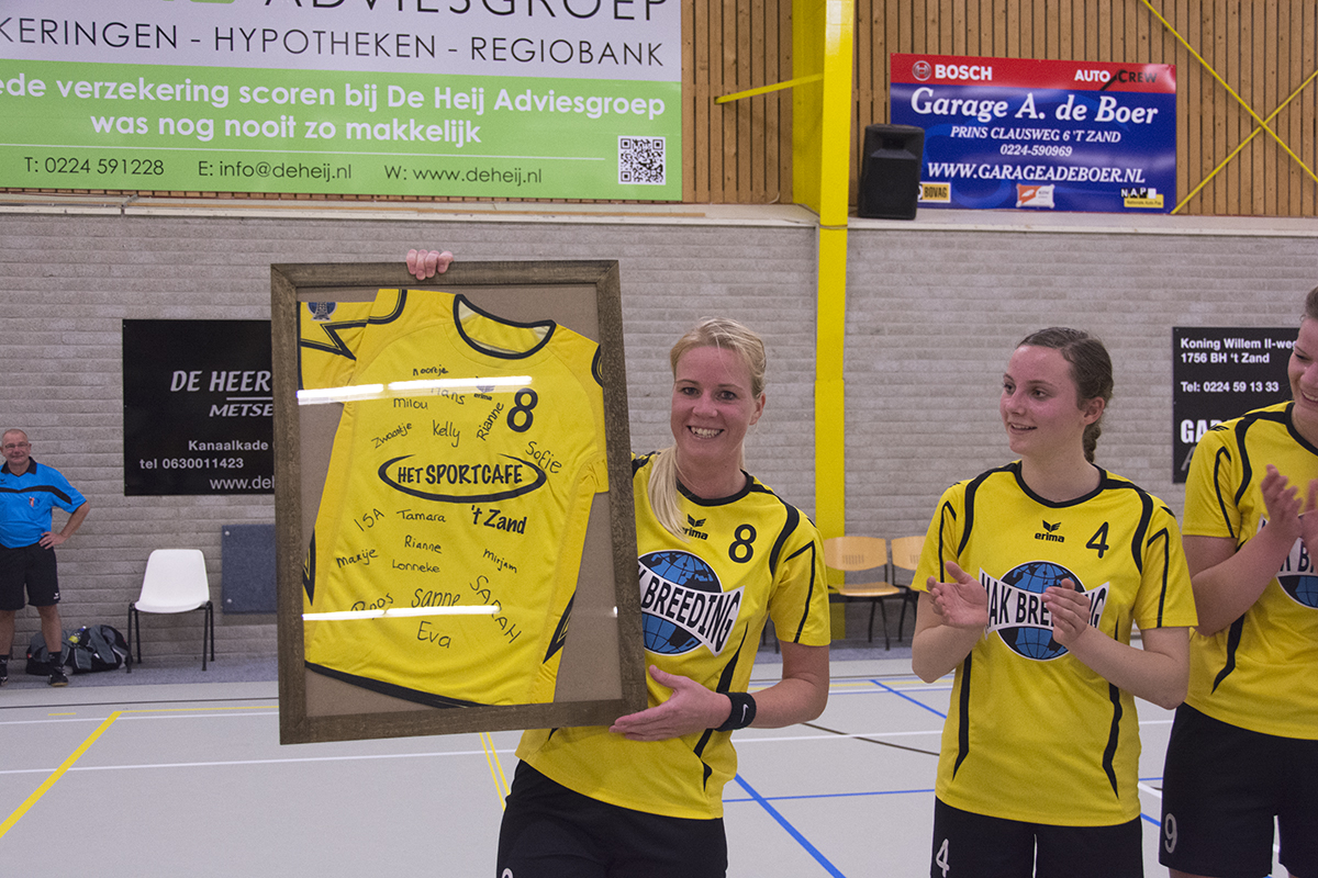 In de thuiswedstrijd tegen NEA kwam er voor de linkerhoekspeelster een einde aan haar loopbaan. Het zijn juist de thuiswedstrijden – met muziek voor de wedstrijd en veel publiek – die haar de kick gaven van het spelletje. Na afloop kreeg ze een ingelijst shirt, een herinneringsboek en warm applaus van de toeschouwers. Fotograaf André Sonderman was erbij en legde het afscheid vast op de gevoelige plaat.