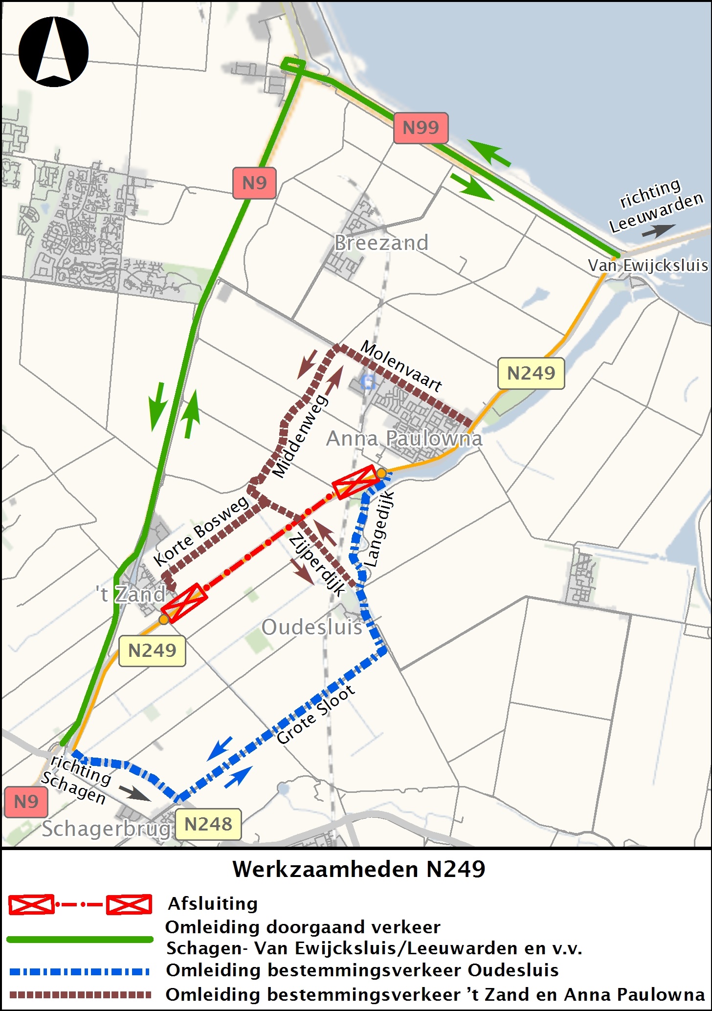 Het doorgaande verkeer vanuit Leeuwarden/Van Ewijcksluis richting Schagen wordt omgeleid via de N99, N9 en vice versa. Bestemmingsverkeer op de Anna Paulownaweg (N249) tussen de Keinsmerweg in ’t Zand en de Lagedijk/Randweg in Anna Paulowna wordt plaatselijk omgeleid. De omleidingsroutes staan met gele borden aangegeven. De rotonde van de Anna Paulownaweg (N249) in ’t Zand blijft open voor bestemmingsverkeer van en naar de Keinsmerweg. Om het verkeer te begeleiden worden verkeersregelaars ingezet.