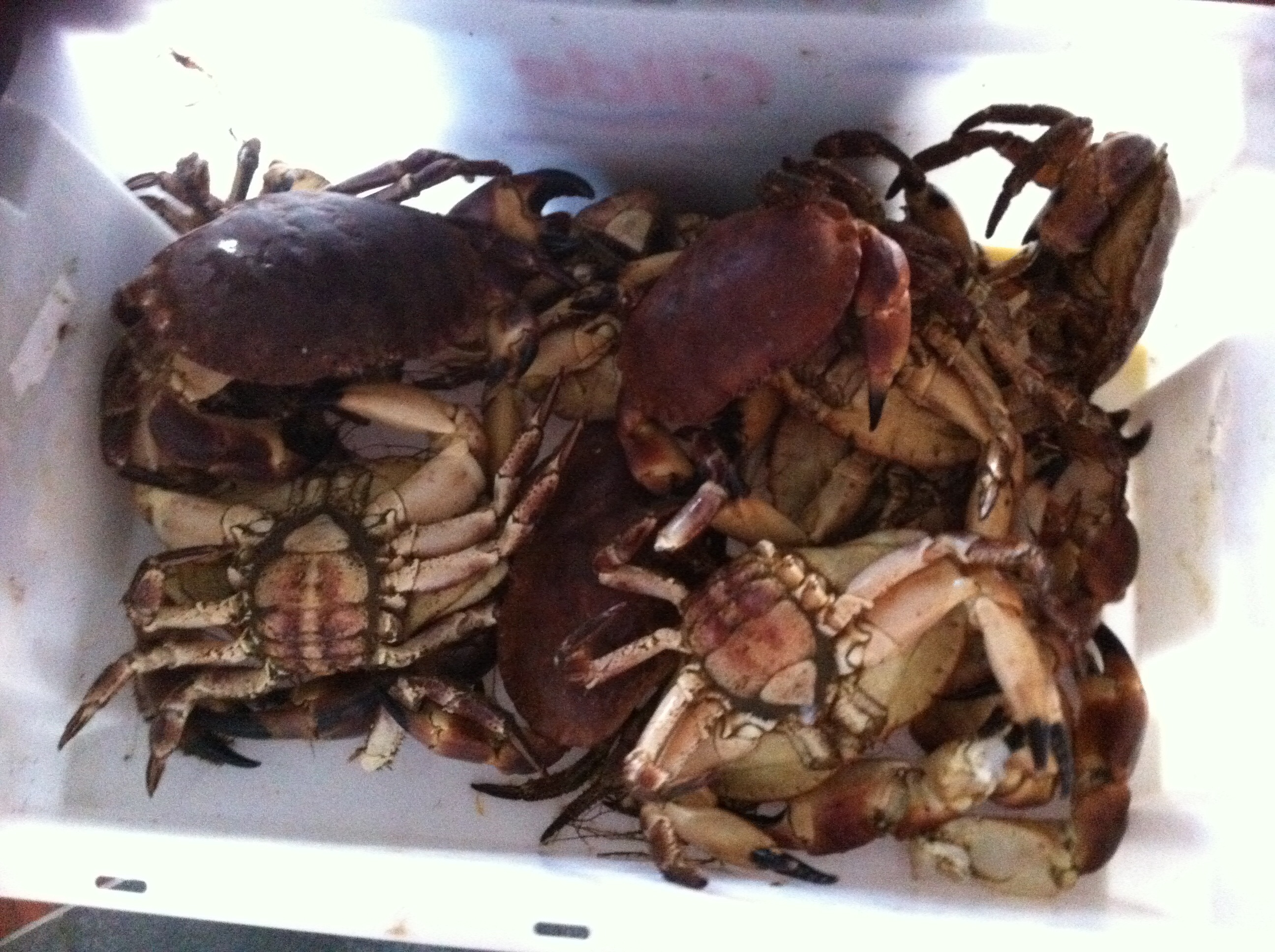 Moet ik niet vergeten dat we, ook geen big 5 genomineerde maar wel zeer imposante vissen hebben gezien. Als ook krabben. Zelf gevangen, zelf gekookt, zelf opgegeten. Heerlijk! En midden in een groot stadachtig dorp zagen wij tot ons groot plezier een otter rond rennen tussen de stenen van het watervalletje van de berg. Ook niet een van de big 5 maar spontaan in het wild een leuke verrassing. Oh ja en een hert zagen wij wel, maar helaas achter in de bak van de jager, 2 stuks om precies te zijn, ze waren prachtig. Manlief bleek tevreden over zijn beslissing het aanbod om mee op jacht te gaan nog even af te slaan. Schieten is machtig maar op levende wezens richten moet hij zich nog even geestelijk voorbereiden. Komt goed, want een hertenbiefstuk is best welkom in onze koekenpan. Legaal , dat wel om de mensen die nu in opstand komen voor te zijn. Maar een hert of eland in “levende lijve” ontmoeten bleef uit, dus besloten wij ze zelf op te zoeken. Een rustig weggentje, even verder op, getipt door onze buurtgenoot. Tegen het schemerlicht is de kans groot ze daar tegen te komen. Dus togen wij, in boswachter groen, en paardenpoepbruine kleding (met daarover heen een fluorescerend jasje om de benevelde jagers er op attent te maken dat wij, inclusief Mona géén waardig prooi voor hen zijn) richting getipte-kans-op-drinkende-herten-beboste plekje. Onze auto parkeerde we verderop en manlief en mijn persoon zette onze voeten zachtjes neer op het bemoste landweggetje, turend tussen de bomen door, hopende iets wilds te spotten. SLOF SLOF SLOF ……..Daar kwam dochter 1, SLOF-SLOF-SLOF, ssssssstttttttttt til je voeten op. DAT GAAT MOEILIJK WANT MIJN LAARZEN ZIJN TE GROOT EN MIJN SOKKEN TE GLAD EN ALS IK ANDERE SOKKEN AAN HEB DAN GLIJDEN ZE NIET ZO MAKKELIJK VAN MIJN VOETEN WANT DAT HAD IK OP SCHOOL OOK TOEN IK GING HANGEN AAN DE TOUWEN GLEDEN MIJN LAARZEN UIT EN MIJN VRIENDINNETJE MOEST LACHEN EN IK OOK EN TOEN ssssssssst we willen graag herten of misschien zelfs een eland zien. Oh ja, sorry. Dochter 2 WAUW KIJK WAT EEN MOOIE PADDENSTOEL DAT IS EEN GIFTIGE WANT TOEN WE GISTER OP TUR WAREN HEEFT DE MEESTER VERTELD DAT DE RODE GIFTIG ZIJN EN DE WITTE NIET NET ALS DIE RODE BESJES DIE KAN JE WEL ETEN MAAR DE PAARSE BESJES NIET EN ALS sssssssst stil nou we willen……..WAFWAFWAFWAFWAFWAF SSSSSSSST MONA WE WILLEN…….onverrichte zaken , met een frisse neus, dat wel en een uitgelaten hond…….Uitgelaten kinderen ook, keerden we huiswaarts. Echt, we zien ze vast nog wel eens, maar nu nog even niet.