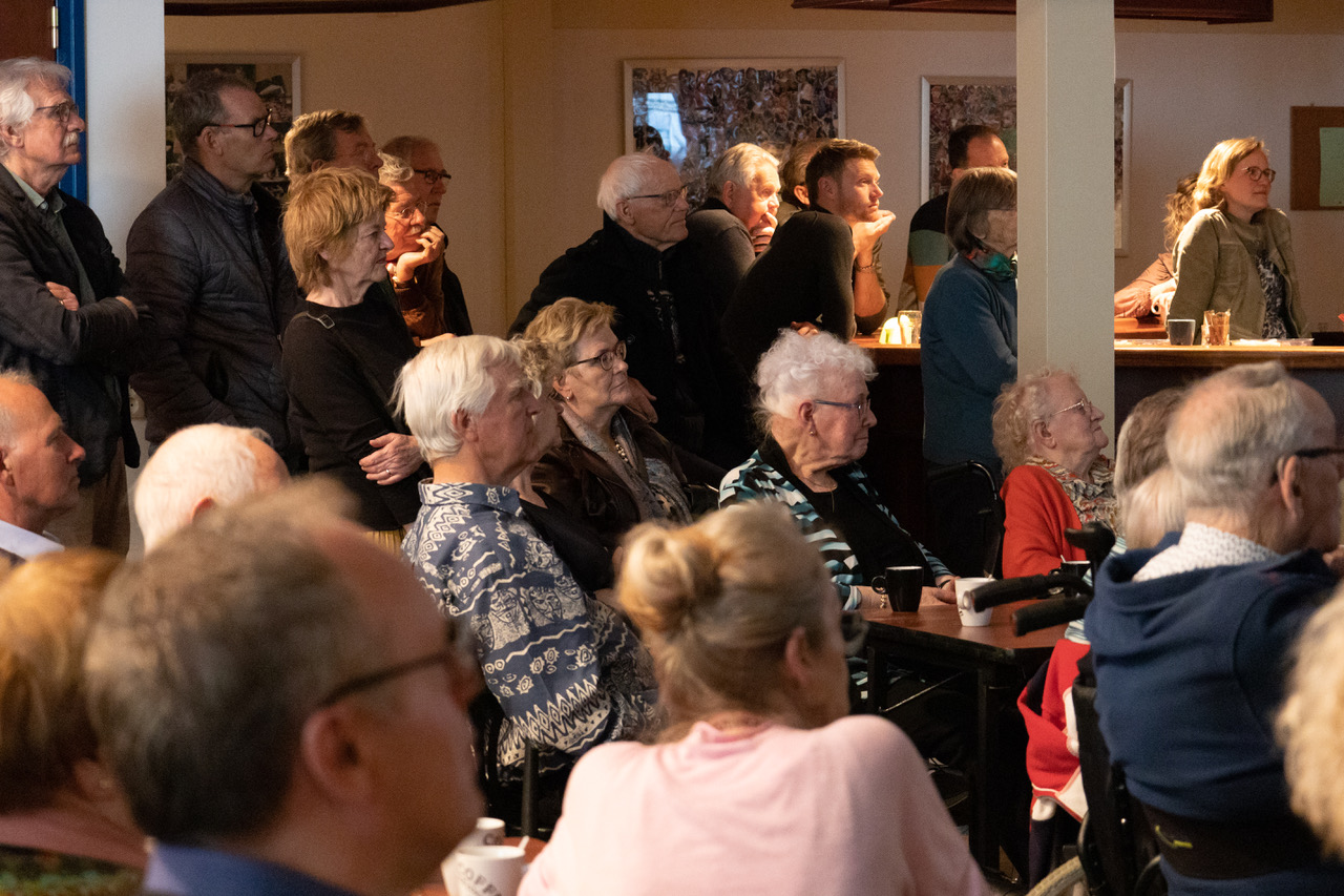 De foto’s van Joris Langedijk bieden een kleine impressie van de zaal. Het eerste boek werd uitgereikt aan Mevr. Riet Kok-van Kampen als dank voor de vele informatieve bezoekjes én kopjes koffie die Cees gekregen heeft.