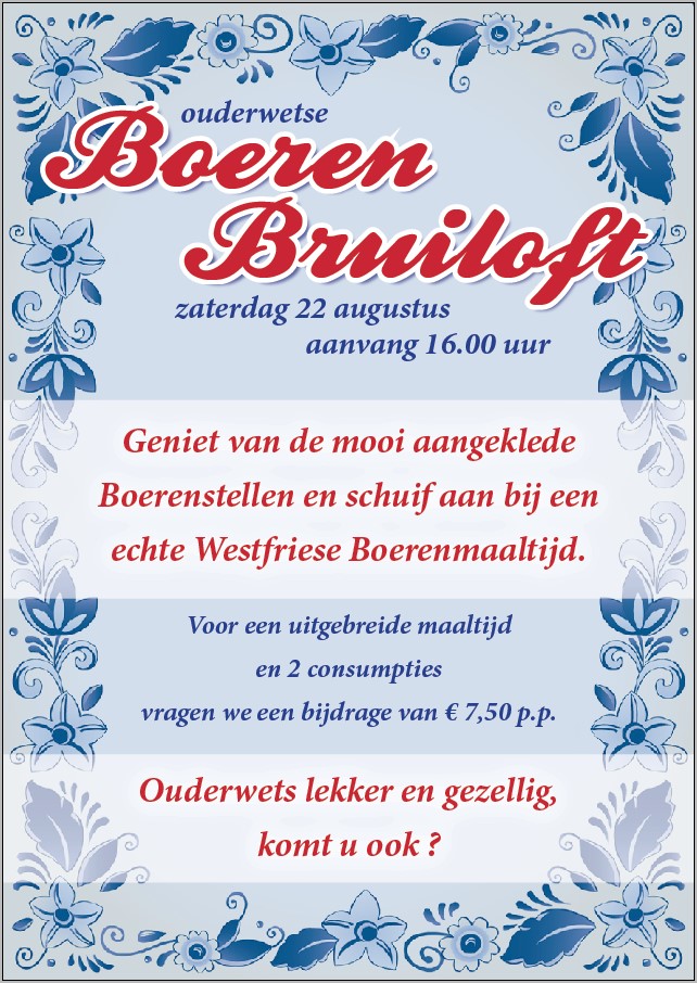“Samen eten, drinken en genieten van een aantal stellen, mannen, vrouwen en kinderen gekleed in traditionele West-Friese klederdracht.” Na een welkomstdrankje worden een aantal in West-Friese klederdracht gestoken (bijna) dorpsgenoten door de ceremoniemeester nader voorgesteld en kan het feest beginnen. “Op een echte West-Friese bruiloft kan het natuurlijk niet ontbreken aan sterke verhalen en leuke anekdotes. Ook tijdens deze bruiloft is hier natuurlijk alle ruimte voor en beklimmen meerdere sprekers/spreeksters het spreekgestoelte. Tussendoor worden de verschillende gangen van het diner opgediend. In samenwerking met de keuken van verzorgingshuis de Zandstee worden een aantal echt ouderwetse gerechten volgens oma’s recept bereidt. Het feest wordt omlijst door passende muziek en voor wie dat wil kunnen zelfs de voetjes nog even van de vloer.”