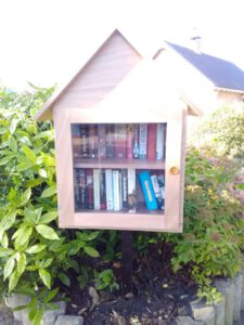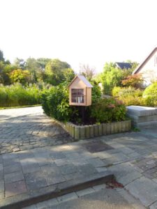 Vervolgens werd ’s middags de feesttent in de straat opgezet en was ’s avonds onze jaarlijkse barbecue. Pas in de loop van de avond vielen de eerste regendruppels. We hadden mazel met de weersvoorspelling zoals die de hele week was. Deze bleek gelukkig niet te kloppen, zodat we een mooie dag hadden om buiten te werken en onze tent niet de lucht in ging door de stormachtige wind die was voorspeld. O ja, wat nog niet is vermeld is het feit dat de Mauritsstraat sinds Burendag een eigen “buurtbieb” heeft. Buurman Johan Visser heeft een prachtig ‘uitleenhuisje’ gemaakt dat zaterdag in de beits is gezet en deze week op een paal wordt bevestigd, waarna er boeken in worden gezet die voor de buurt beschikbaar zijn. Een idee wat je in het oosten van ons land wel meer ziet, maar in ons dorp nog niet was gesignaleerd. De Mauritsstraat heeft dus waarschijnlijk de primeur. Kom kijken of er iets van uw gading bij staat en ruil uw boek daarvoor in, zodat een ander daar weer plezier aan kan beleven…