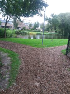 De groep vrijwilligers die het hertenkamp beheren en onderhouden en waarvan een aantal in de Mauritsstraat wonen, had van het voorjaar aangegeven dat het schelpenpad in het park op sommige punten slecht werd. Contact met de gemeente leerde ons dat zij ons wel schelpen wilde leveren als we ze zelf wilden verspreiden. Ah, een mooie actie voor Burendag. Dus met gemeente afgesproken dat we dit in de week van 20 september op zouden pakken. Zo gezegd zo gedaan. Op donderdag 20 september werd er 10 kuub schelpen gestort en een aantal vrijwilligers begon al vast aan het uitrijden en verspreiden. Een kleine hoeveelheid werd nog bewaard voor de zaterdag van Burendag.