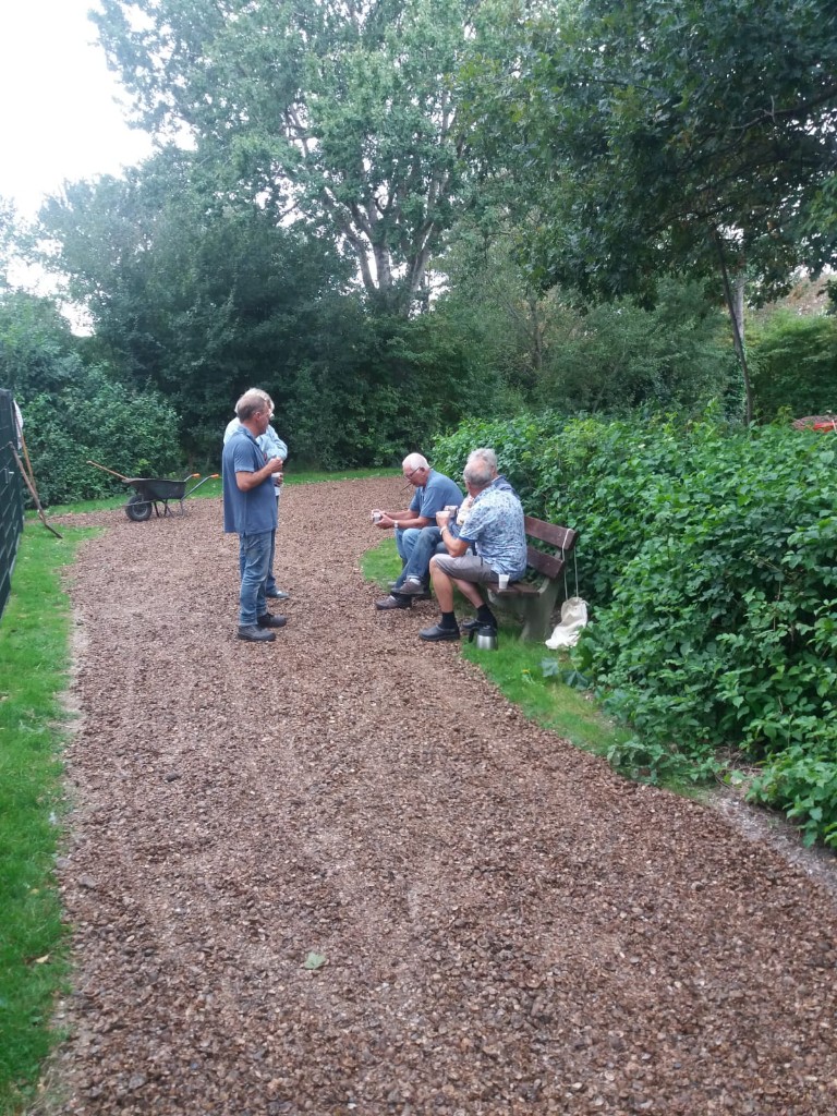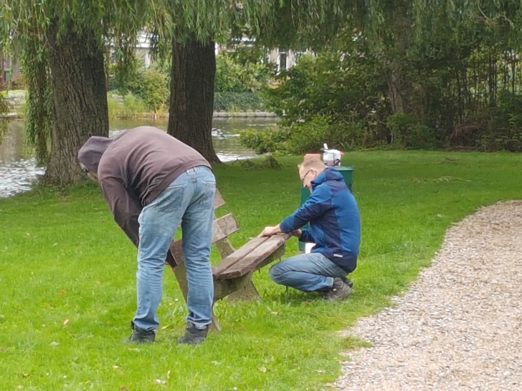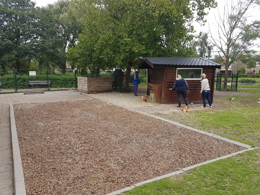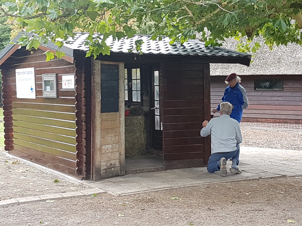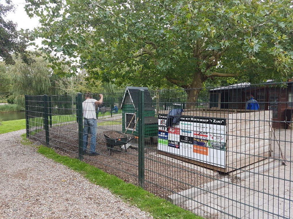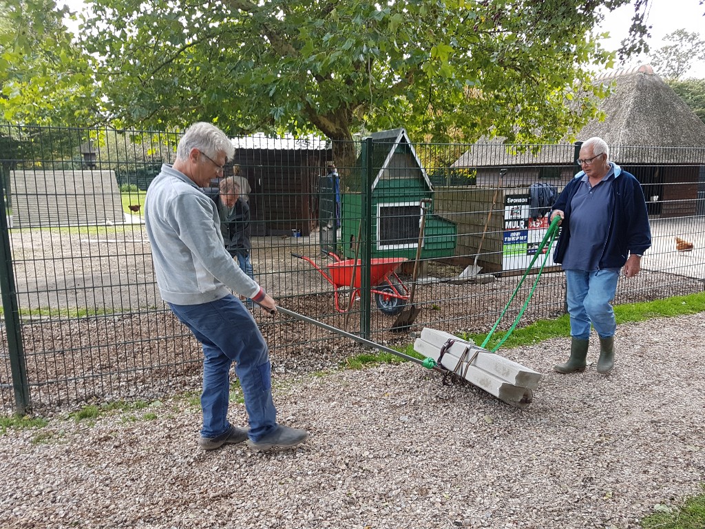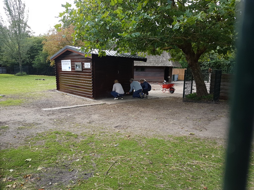 Het restant werd dus op zaterdag door bewoners uit de Mauritsstraat nog uitgereden. Ook een pad in en de voederplaats in het hertenkamp werden met schelpen aangevuld. Daarna werd met een rol de schelpen enigszins vast gerold, zodat mensen met een rollator ook weer door het park kunnen lopen. Andere bewoners schilderden de nachthokken. Doordat de dieren tegen het hout aan schuren, kan dit ieder jaar wel weer opnieuw woerden gedaan. Maar doordat we het ook ieder jaar weer schilderen, ziet het geheel er nog heel knap uit. Ook de bankjes in het park zijn weer van een nieuwe verflaag voorzien en de picknicktafel bij de vijver is gerenoveerd en weer in dennengroen geschilderd.
