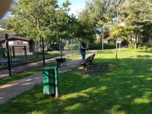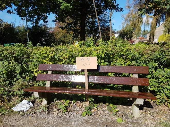 Op verzoek van de bewoners zijn er door de gemeente namelijk een vuilnisbak en een hondenpoepzakjeshouder (goed woord voor scrabble) bij de vijver geplaatst, dus het is nu een kleine moeite om de hondenpoep op te ruimen.