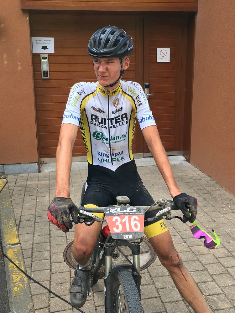 Er stonden bij de nieuwelingen 54 renners aan de start die in het dorp startte. Coen had een sterke start op de 500 meter klim vanuit het dorp naar het bos toe. Hij dook met de kopgroep van 10 man het bos in om de afdelingen te nemen. Helaas, daar ging het mis want Coen was te gretig waardoor de focus iets afname waardoor hij driemaal hard ten val kwam. Elke keer weer opgestapt en richting de eerste verzorgingspost. Daar kwam mij met flinke vertraging als 35e door. Na deze harde les stug doorgefietst met 100% focus op het parcours en met name de afdelingen. Elke ronde hard doorgereden en per ronde diverse renners ingehaald richting top 25. Na de eerste ronde was in 1 afdaling de A en B lijn afgesloten (alleen de C lijn over) omdat er een renner ernstig geblesseerd was. Door de duur en hitte, 30 graden plus, tijdens het fietsen kregen vele renners het erg zwaar waardoor de snelheid sterk afnam.
