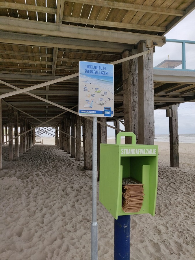 Het is duidelijk te zien waar de zakjes zijn, want er staat een groot bord bij. In totaal zijn er elf borden op genoemde stranden. Elke keer bij een strandpaviljoen. Op het bord staat een grote foto van het strand met de zee, golven en meeuwen. Maar ook afval en informatie erbij hoe lang afval niet vergaat. Helaas blijft zwervend plastic zelfs oneindig, dat vergaat niet maar valt hooguit in kleine stukjes uiteen. Hopelijk is het voor iedereen die het bord ziet een aansporing om een zakje te pakken, daar afval in te doen en in de afvalbak te gooien of thuis in de vuilcontainer. In elk geval om geen afval achter te laten op het strand.