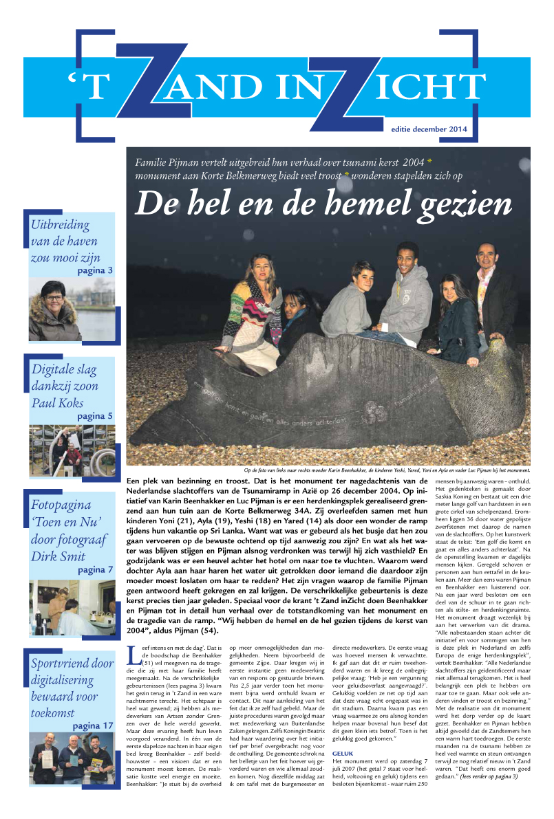 De kerstkrant ’t Zand inZicht wordt dit weekend verspreid onder ruim 26.000 huishoudens in de gemeente Schagen en de dorpen Anna Paulowna, Breezand en Wieringerwaard. In de krant onder meer het uitgebreide verhaal van de familie Pijman. Zij waren tien jaar geleden in Sri Lanka tijdens de tsunami en hebben bij hun