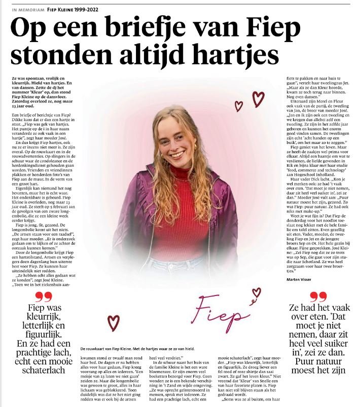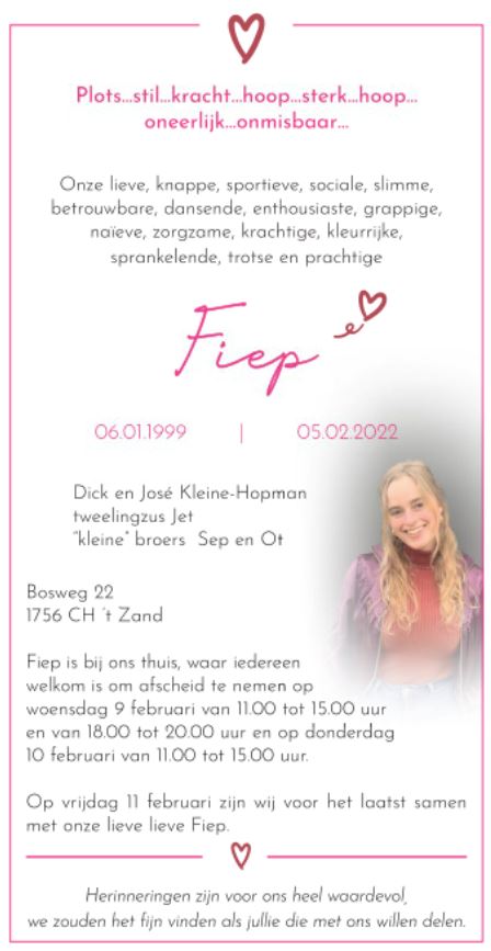 Iedereen die Fiep een laatste groet wil brengen en haar familie wil steunen, is welkom om aan te sluiten op deze route.
