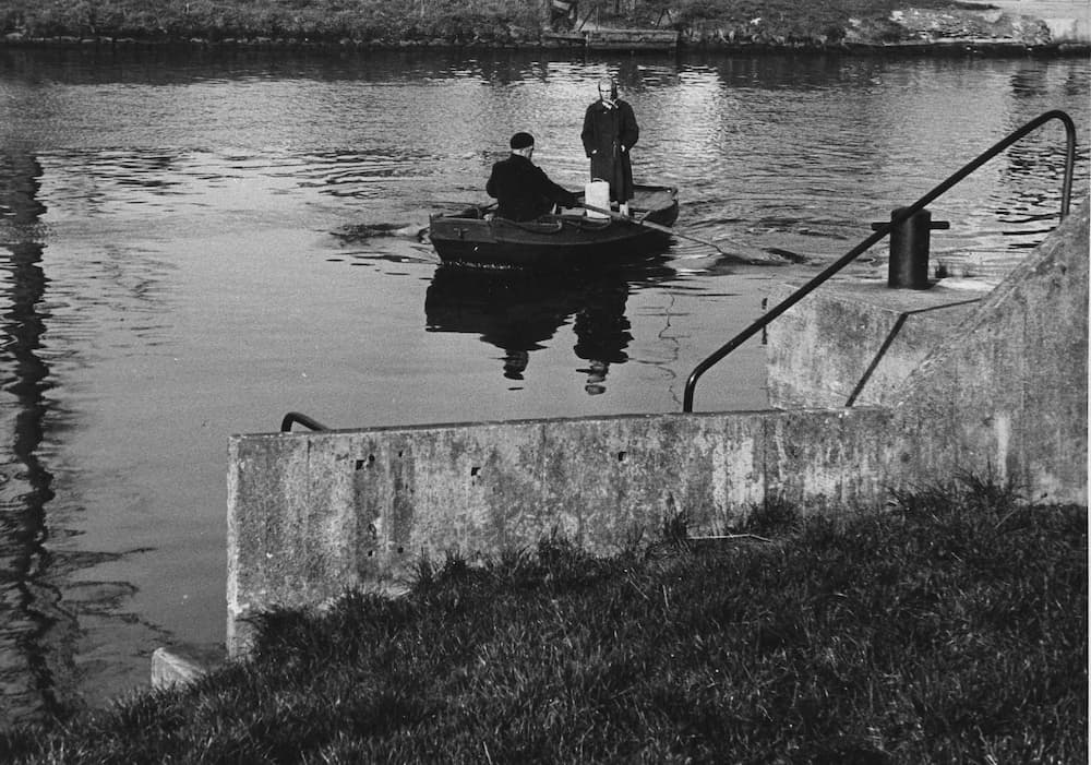 Overzetbootje in het Noord-Hollands kanaal bij Zijpersluis, ca. 1960