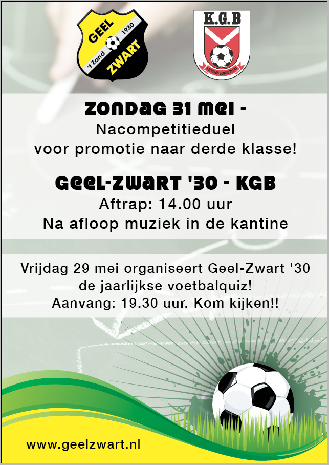 De ploeg van Ed van der Pol kan hierbij alle steun gebruiken. Na afloop van de wedstrijd is er muziek in de kantine. Voor het duel maak je kans op prijzen. Met dank aan coach Ed wordt er een loterij gehouden. De aftrap van Geel-Zwart tegen KGB is 14.00 uur.