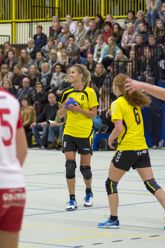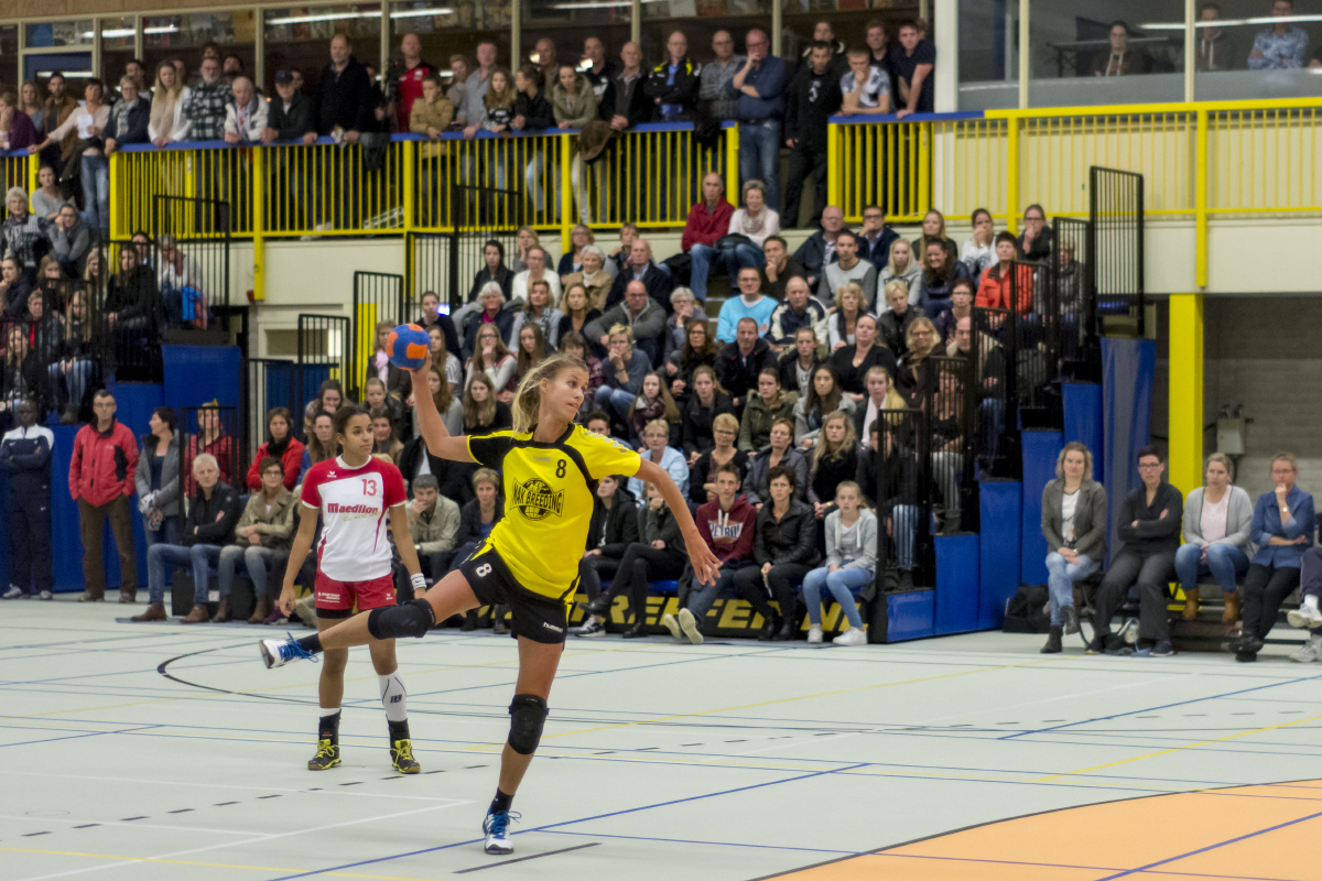‘In de eerste minuten wist Havas als eerst te scoren, waarna Geel Zwart in achtervolging ging. De stand ging gelijk op (3-3). Hierna wist Geel Zwart een gaatje te slaan door goede, snelle aanvallen en door goed keeperswerk van Sarah Wiggers (7-4). Toch wist Havas bij te blijven en kwam elke keer terug tot twee punten verschil (12-10). Geel Zwart wist voor rust nog twee maal te scoren waardoor de marge opliep tot vier punten in de rust (14-10).’