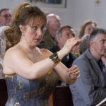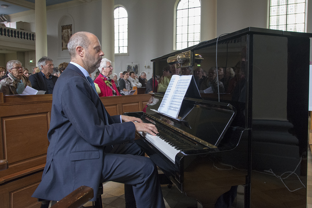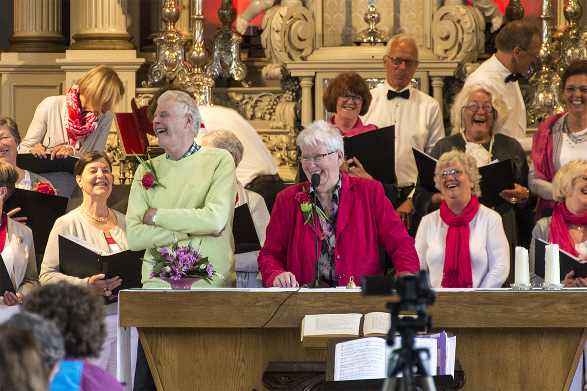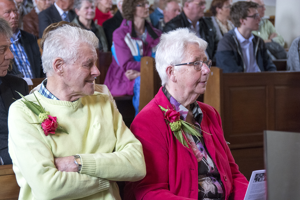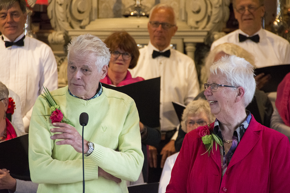 Een bijzonder moment was de start van het concert met het Bruidskoor van Wagner. Op de klanken van deze muziek heeft het jubilerende echtpaar hun weg gevonden naar de zitplaatsen voorin de kerk. Dat moet wel heel speciaal geweest zijn. Korte tijd daarna, tussen het Zum Sanctus en het Panis Angelicus, namen zij kort het woord om uit te spreken hoe zeer zij in die 50 jaar met elkaar vergroeid zijn geraakt. Daarbij hoorde een anekdote van Kees over het moment in 1958 waarop hij zijn vrouw op de kermis van Anna Paulowna (toen ook in Breezand) heeft ontmoet. Dirigente Elena Syssojeva stal de show met haar overtuigende manier van dirigeren. Voor koor en muzikanten inmiddels gewoon, maar voor publiek (altijd) een belevenis. Halverwege bracht zij als sopraan, begeleid door koor, een prachtige aria uit de opera Semiramide ten gehore. Rond 13.00 werd het programma afgeronden en werd aan mensen de mogelijkheid geboden hun waardering voor het concert uit te spreken in de vorm van een gift aan het goede doel “Plan Nederland”. De familie Vlaar bedankt via deze weg alle gulle gevers. Het koor en muzikanten mochten het “podium” niet verlaten voordat zij prachtige tulpenbossen ontvingen uit handen van de familie: “Je bent nu in ’t Zand, en daar hoort een bos tulpen bij!”. Het feestje ging met vijftig personen nog even door bij Kees en Annie thuis, met koffie, taart, borrel, “stukkie” en buffet! Het bleef er nog lang onrustig…
