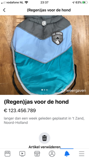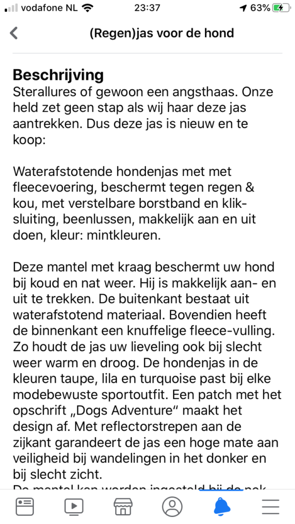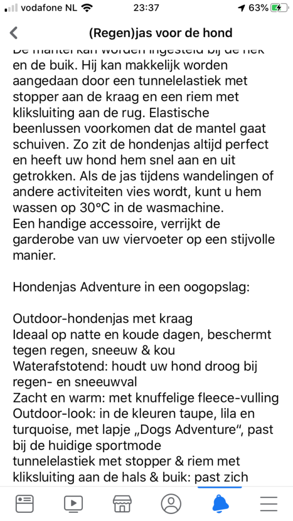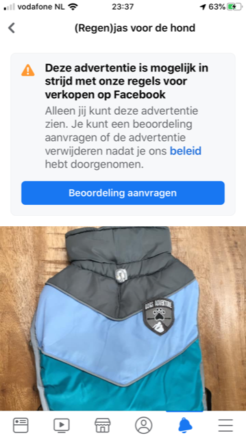 Dus bood ik dit jasje te koop aan op facebook. Ik weet het, het klinkt zwaar misdadig. Maar wie weet kon ik een ander hondje, misschien een oudje waar de gewrichten wat stroefjes bij worden wat warmer gemak bieden. Of een jonge uitbundige pup met rare sprongen leren wennen aan het dragen van een jas bij koudere dagen omdat de vacht niet afdoende is. Zo iets had ik in mijn hoofd. Dat dit aanstootgevend en ongepast gedrag zou kunnen zijn, écht daar had ik geen tel, geen nanoseconde bij stil gestaan. Toch kreeg ik gister, weken na het plaatsen van deze advertentie het bericht dat mijn advertentie verwijderd was omdat hij mogelijk in strijd was met de regels voor het verkopen op facebook. Of ik het beleid even door wilde lezen dan kon ik daarna voor ook mijzelf deze advertentie verwijderen. Jawel, ik heb de mogelijkheid gekregen om een beoordeling aan te vragen maar voor mij is duidelijk, Facebook slaat wederom flink de plank mis.