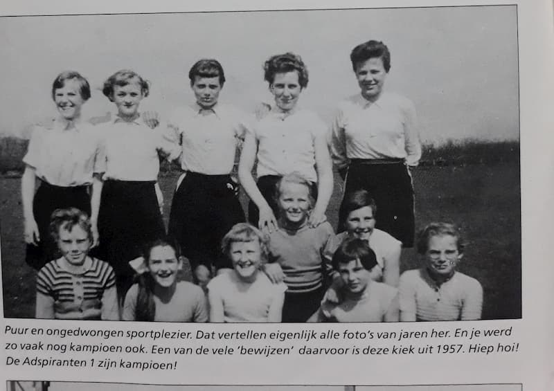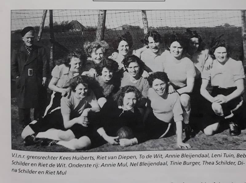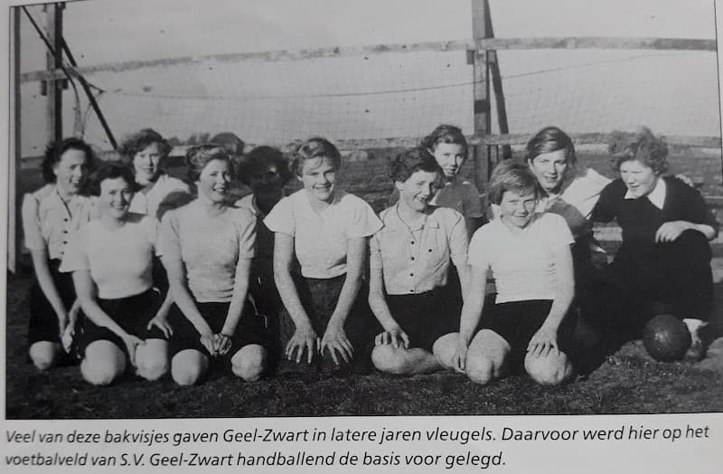 Hieronder nog oude teamfoto’s welke ook in het jubileumboekje van het 50-jarig jubileum stonden. Handballen op het voetbalveld in blouse en rok!