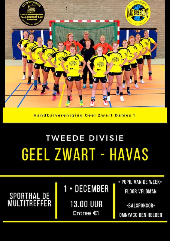 | 1 dec 13:00 uur | Geel Zwart DS1 – Havas DS1 | Scheidsrechter: Willem v. Troost / Jaap Faber |