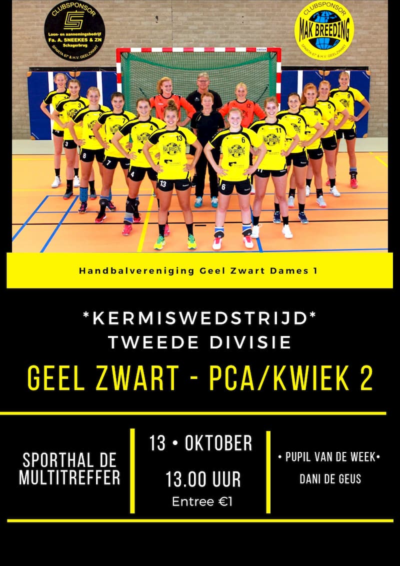 | 13 okt 13:00 uur | Geel Zwart DS1 – PCA/Kwiek DS2 | Scheidsrechter: Leen Cornelisse / Koos de Groot |
