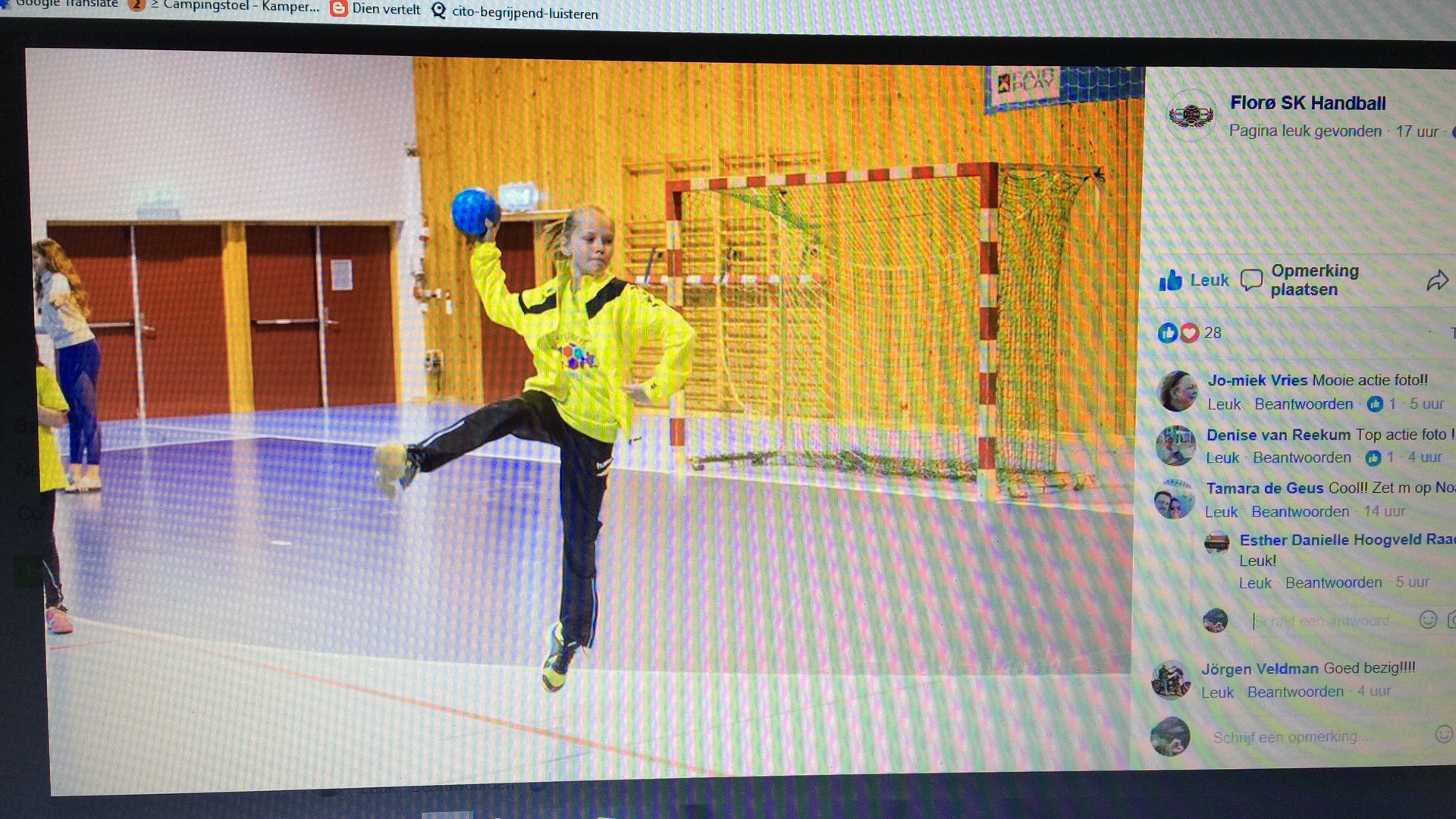 Een geweldig georganiseerd evenement waarin iedere Fries dorp gestempeld moest worden nadat er gekluund was, onder de brug door gereden en warme chocolademelk met een speculaas was genuttigd. Alles in een gek outfit. Alle verenigingen. Dus het was 1 groot gekkenhuis op dat ijs. Wel leuk om een kip, smurf en zelfs grote zak patat over het ijs te zien glijden. Hier in Svelgen is geen schaatsbaan en tot mijn groot verdriet geen handbal. De afstand naar een wel handballende stad is te groot. Maar stoere dochter “gaat dan wel” op volleybal. Volleybal heeft mij nooit zo gelegen. Misschien omdat het bij mij op school tijdens de sportdagen met alle sporten wel goed af ging, behalve met volleybal. Ik dacht iedere keer als de bal op mij af kwam de poses aan te nemen die ik op tv zag, maar als de bal op mijn handen weg kaatste was dat altijd vreselijk de verkeerde kant op. Ik kon dat nooit uitstaan. Wilde iets kunnen en dan wel meteen maar bij de volleybal lukte dat gewoon niet. Dochterlief heeft het snel onder de knie en vind het enorm leuk. Ik geniet ervan naar haar enthousiasme inzet te kijken. Ze heeft spelinzicht en balgevoel. Sjemig, daar ben ik trots op. En het geeft me een gerustgesteld gevoeld dat in de tijd dat zij niet handbalt toch bezig is met de bal. En dus als we terug in Nederland zijn en zij weer verder gaat met de handbal niet onder een steen vandaan komt gekropen. Maar hopelijk snel weer aan kan sluiten. Onze handbalballen hebben we uiteraard mee genomen en als de zaal vrij is probeer ik de meiden te stimuleren even lekker te oefenen. Ze doen wat trucjes, sprongschot, gooien op doel en luisteren naar mijn aanwijzingen maar zodra het kan taaien ze af en trekken zij zich terug met hun klasgenootjes. Mij achterlatend met de cirkel, de stippellijn, dat schitterende doel en die nog mooiere bal. Ik knal een paar keer genadeloos in de hoeken, wat een heerlijk gevoel geeft dat toch. Ja , de handbal mis ik wel. Gelukkig is dit voldoende op tv, de Noren weten wel wat handbal is. In de auto terug naar huis zeg ik dan ook “meiden, mam gaat straks ff lekker een handbalwedstrijd op tv kijken .” “oké mam, hé mam, als we terug in Nederland zijn blijf ik op volleybal, ik vind het zo leuk”. …………………………………………………………………………ik slik even…………………………………………..Okay meid, doe je goed. Ik kan mn aandacht niet zo goed bij de wedstrijd houden.