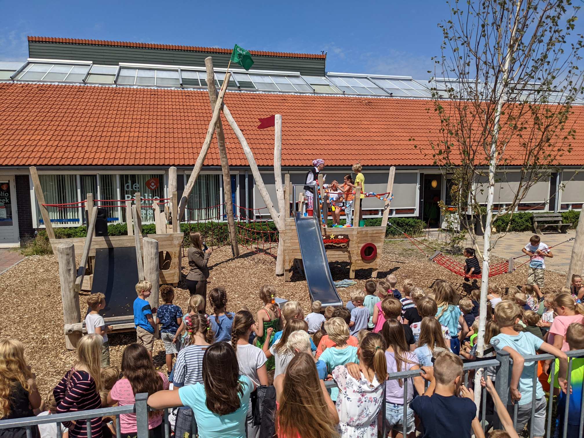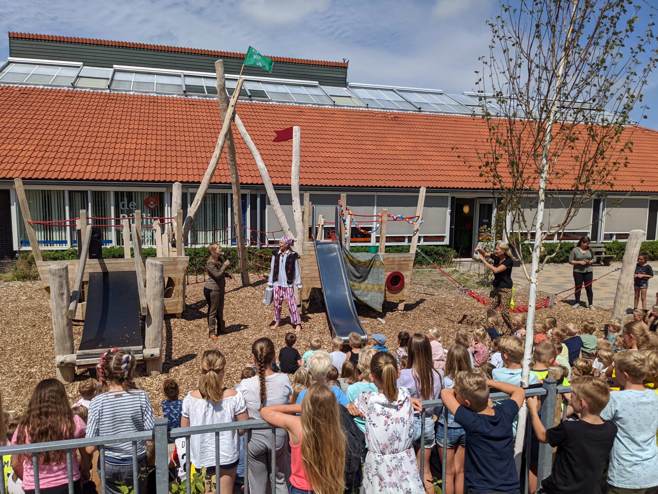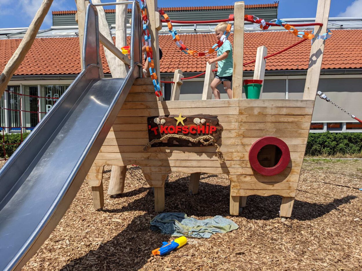 Donderdagmiddag was het dan eindelijk zover. Het gestrande schip op het schoolplein van de Bloeikas heeft een naam gekregen en is daarmee officieel gedoopt tot: ’t Kofschip.