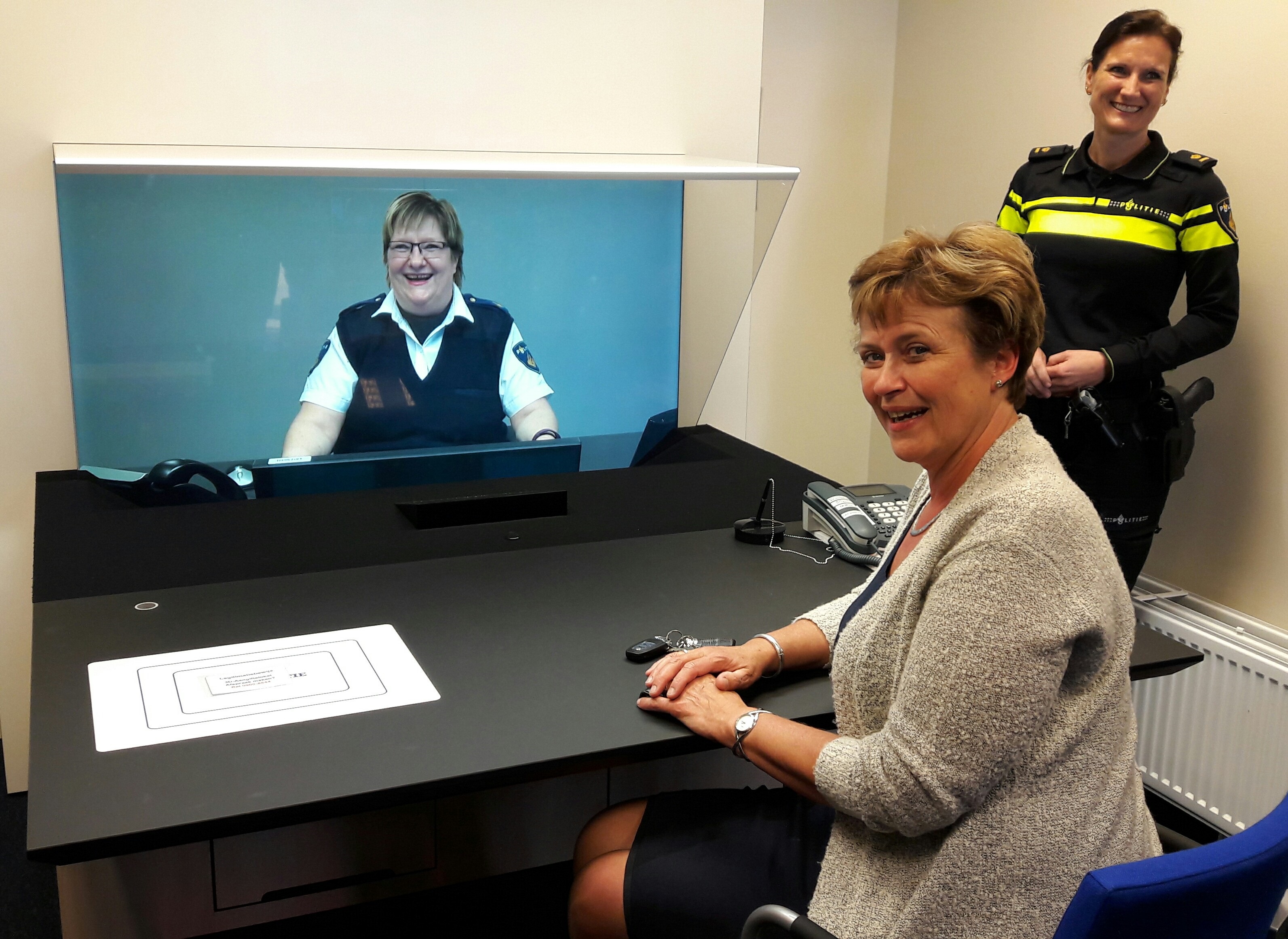 Burgemeester Van Kampen opent het 3D-aangifteloket in Schagen, op het beeldscherm politiemedewerkster Marjon Arnold, die vanuit de bedienstudio in Alkmaar de aangifte opneemt.