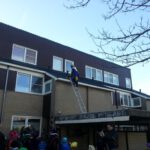 Tijdens het rondje lopen bleek al gauw dat dit veel te vermoeiend voor de opa-Piet was. Hij mocht dan ook even uitrusten in de Jonge Prins. Wij liepen verder en al gauw kwamen wij de zoekgeraakte spullen tegen. Eerst vonden wij zijn sloffen, daarna een fles van zijn favoriete drankje, we vonden een zak met cadeautjes, zijn muts en tot slot nog zijn wandelstok! Dit moesten we maar snel aan hem geven dus op naar de Jonge Prins. Maar wat zagen we daar nou toch weer?? De oude Piet was uit het café gegaan en was op het dak bij meneer en mevrouw De Groot geklommen. Mét zijn rollator!