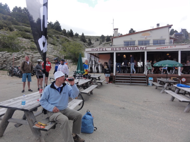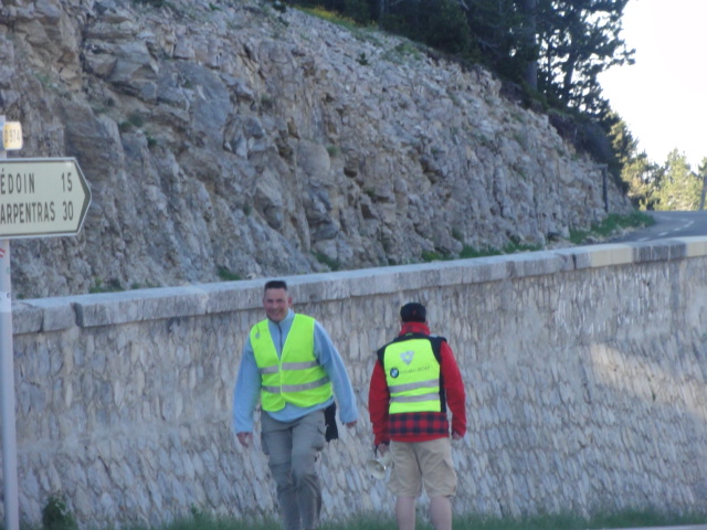 Ondanks dat het parcours minder zwaar was dan vanuit Bedoin, ging ‘het voor geen meter’. Het was net alsof de handrem er nog opstond. Ik kon gewoon geen snelheid maken en mijn benen voelde als lood. Voor de wandelaars waren er 4 verzorgingsposten langs het parcours en bij de eerste post liet ik al doorschemeren dat ik mogelijk maar tot het plateau ging lopen, want het ging gewoon niet. Ik kreeg mijn ademhaling niet op orde, mogelijk door de verkoudheid waar ik de hele week al last van had. Je ademhaling moet echter wel rustig zijn, want anders ga je in no-time hyperventileren door hoge tempo in- en uitademen. Ook bij de tweede rustpost was het nog geen succes en was ik ongeveer halverwege de beklimming tot het plateau. Nadat ik weer op pad was gegaan werd ik ingehaald door een motorrijder die 3 ambulances begeleidde van de Wensambulance. Zij waren met 3 patiënten onderweg naar het plateau of de top, zodat zij daar ‘hun team’ de sportieve prestatie konden zien behalen. Op de een of andere manier kreeg ik daar een boost van (zij zien hun leven op zeer korte termijn beëindigen en ik loop mij een beetje druk te maken over een paar km wandelen).