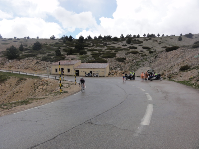 Ik was nog maar net vertrokken toen ik de eerste regendruppels voelde. Op het plateau had ik iemand iets horen over onweer, maar had niet gehoord wat hij daar precies mee bedoelde. Nou dat werd gauw duidelijk, want ik hoorde het gaan rommelen en er zat duidelijk onweer in de lucht. Het ging ook harder regenen en de wind nam toe. Het was koud. Nadat ik een groepje met wandelaars had ingehaald werd ik vervolgens ingehaald door een ALS-patiënt op de tandem. Samen met de begeleidende fietsers werd het groepje iets verder door een motorrijder aan kant gezet en ik begreep uit de reacties dat zij van de organisatie moesten stoppen en terug moesten gaan in verband met het naderende slechte weer. Mij werd echter niets gezegd, dus door naar boven. Wat makkelijker gezegd was dan gedaan, want de positieve boost van een paar kilometer geleden was verdwenen als sneeuw voor de zon. Met pap in de benen ging het heel langzaam naar boven. Ook de paar fietsers die mij nog voorbij gingen vielen door hun lage tempo bijna om. Regen en wind maakte er een ware veldslag van. Het werd stiller op het parcours. De weg was nat geworden en het was voor de fietsers link geworden om naar beneden te gaan.