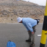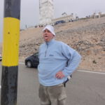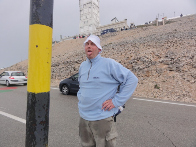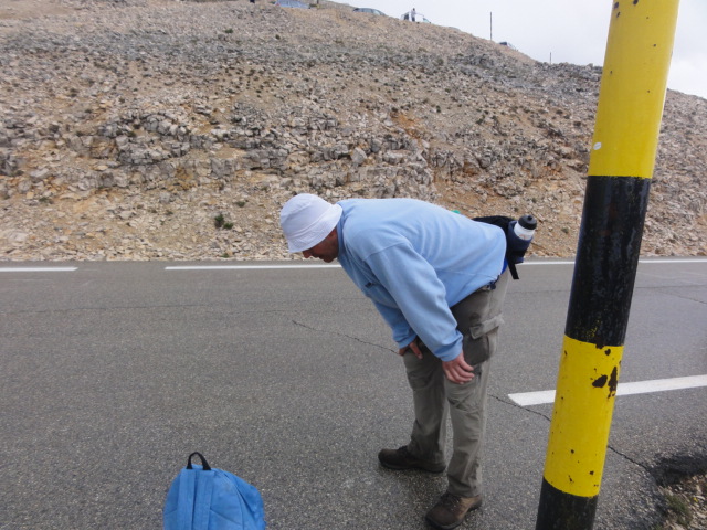 Het zit er weer op… en het is gelukt. Vrijdag 30 mei om 05.15 uur werd ik door Maikel, van de organisatie van de Tour du ALS, naar Bedoin gebracht. In 2013 was deze plaats de startlocatie, maar in 2014 had men voor een andere startplaats moeten kiezen, namelijk Mazan, omdat het gemeentebestuur van Bedoin geen medewerking wilde verlenen. Echter dat zou inhouden dan ik 12 kilometer extra zou moeten lopen en dan zou ik het door die extra looptijd niet 2x op een dag de berg kunnen beklimmen. Vandaar dat ik in overleg met de organisatie een lift kreeg naar Bedoin. Aangezien ik de enig malloot was die 2x de berg op wilde, waren alleen Mirjam en Maikel getuige van mijn start. Bij de fietsenmaker in Bedoin is voor de deur een streep in het wegdek van de D974 gemaakt van marmeren stenen en dat is het startpunt voor de beklimming vanuit Bedoin. Zoals gezegd om 05.15 begon ik aan het avontuur met de bedoeling om in 21,5 km naar de top van de Mont Ventoux te lopen. Het was nog donker en ik had voor de zekerheid een reflecterend vest aangedaan, met rode lampjes op de rug gemonteerd. Achteraf gezien redelijk overdreven, want er was geen kip op de weg. Lopende via de D974 ging de tocht na een bocht linksaf meteen omhoog. Ik kon helaas niet goed in mijn wandelcadans komen en het ging moeizaam. Om 05.30 zouden de fietsers uit Mazan van start gaan en ik had het idee dat ik binnen 1 uur wel achterop gereden zou worden door de eerste fieters. Het duurde echter meer dan 1,5 uur voordat er een fietser voorbij kwam en ruim daarna een 2e en pas daarna kwam de rest. Zij waren aan hun uitdaging begonnen (3x de berg beklimmen).