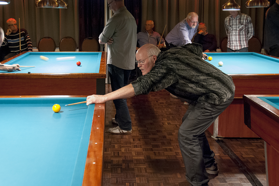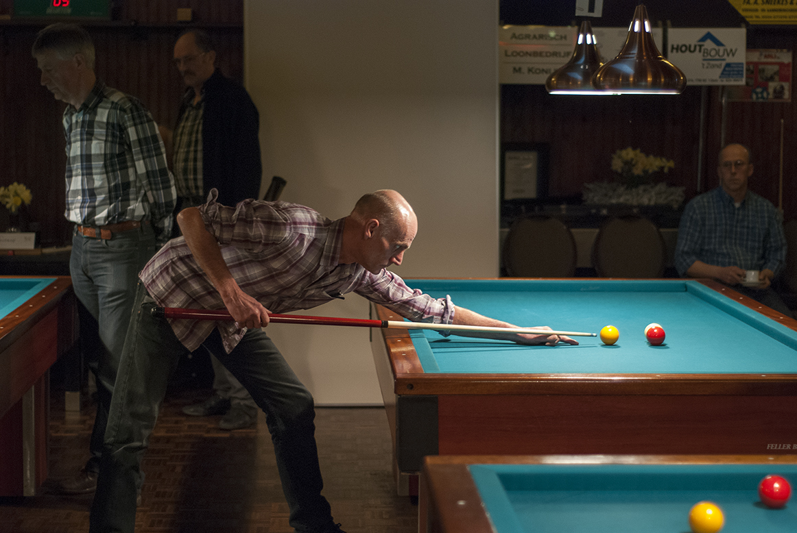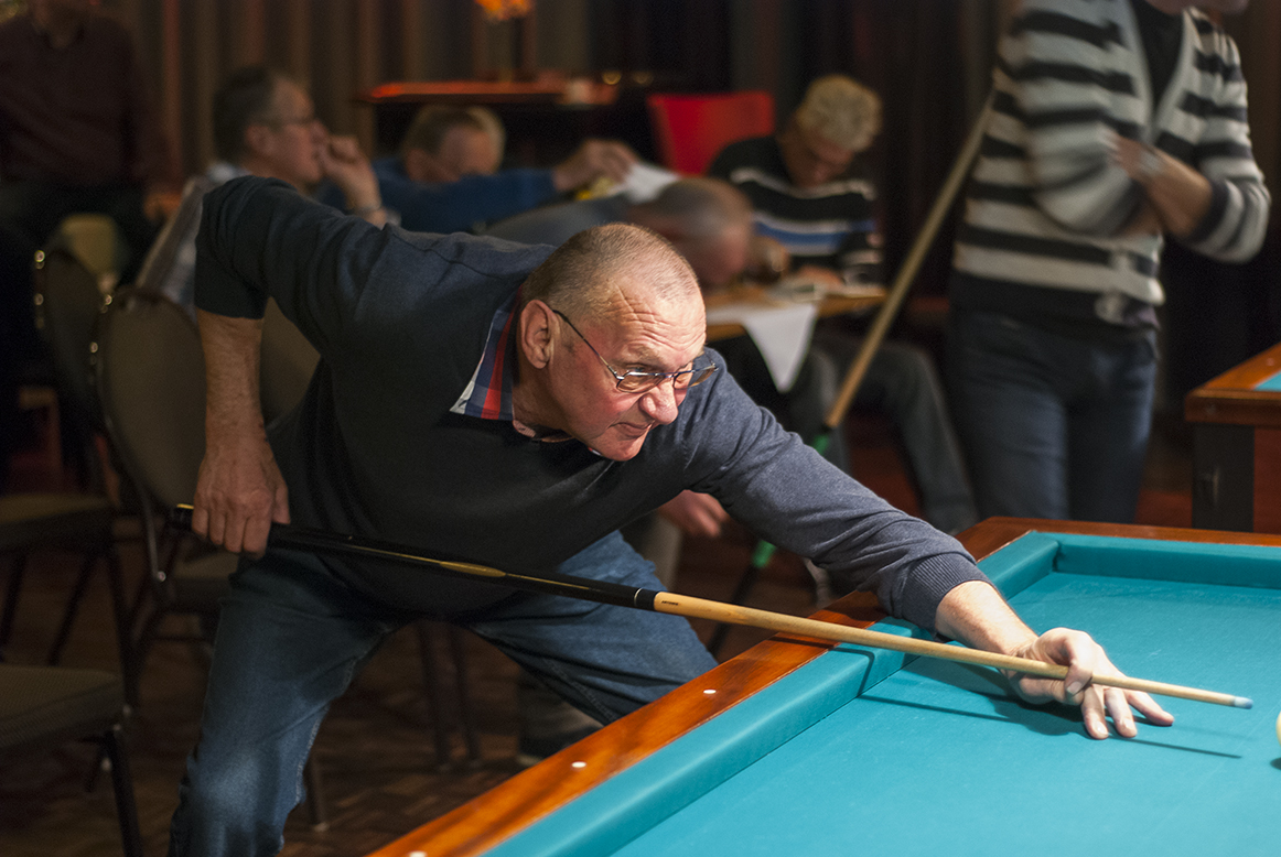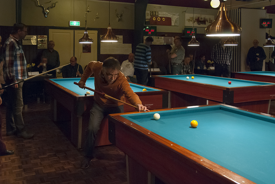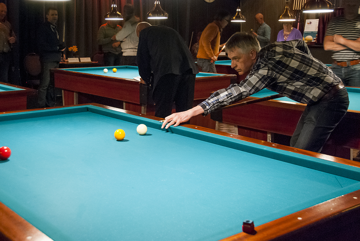 Vervolgens ontspon zich een spannende strijd op de acht biljarts in de zaal van Café Restaurant De Jonge Prins in ’t Zand, met als jongste deelnemer Jaap Bregman uit Schagerbrug (tevens beschermheer van het toernooi en pas 50 geworden) en als oudste Dirk Kramer uit Burgerbrug (89 jaar). In totaal 139 deelnemers, waaronder 14 vrouwen, streden om een plek bij de laatste 32. Deze 32, de nummers één en twee van de 16 poules, bonden op zondag de strijd met elkaar aan om de hoofdprijzen. Daaronder 3 vrouwen, Lenie Mulder uit Petten, Annie Deutekom en Jacqueline Deutekom uit ’t Zand. De hoogste serie tijdens het toernooi kwam op naam van Kees Vlaar uit ’t Zand met 45 caramboles. De kortste partijen gingen tussen Jan Veuger (Sint Maartensbrug) tegen Piet van der Voort (’t Zand) en Piet Spil (’t Zand) tegen Ton Heemskerk (Sint Maartensbrug). Beide duels werden in 7 beurten beslecht. Bij 55 partijen waren het maximale aantal van 25 beurten nodig om tot een winnaar te komen. In het geval van Piet Schouten en Cees (lap) de Wit, beiden uit ’t Zand, leidde dit tot het bijna kleinst mogelijke verschil in moyenne, 0,766666 tegen 0,763636, een verschil van 0,003030.