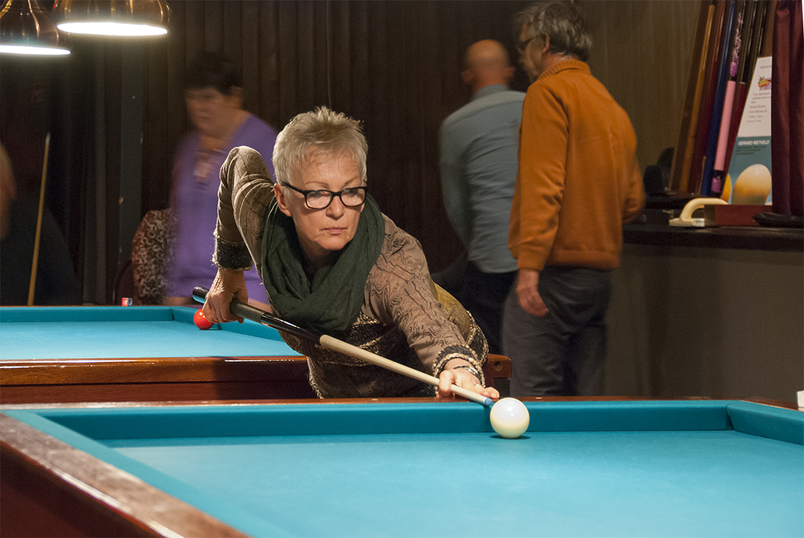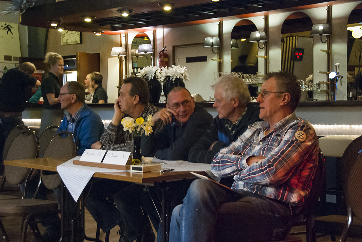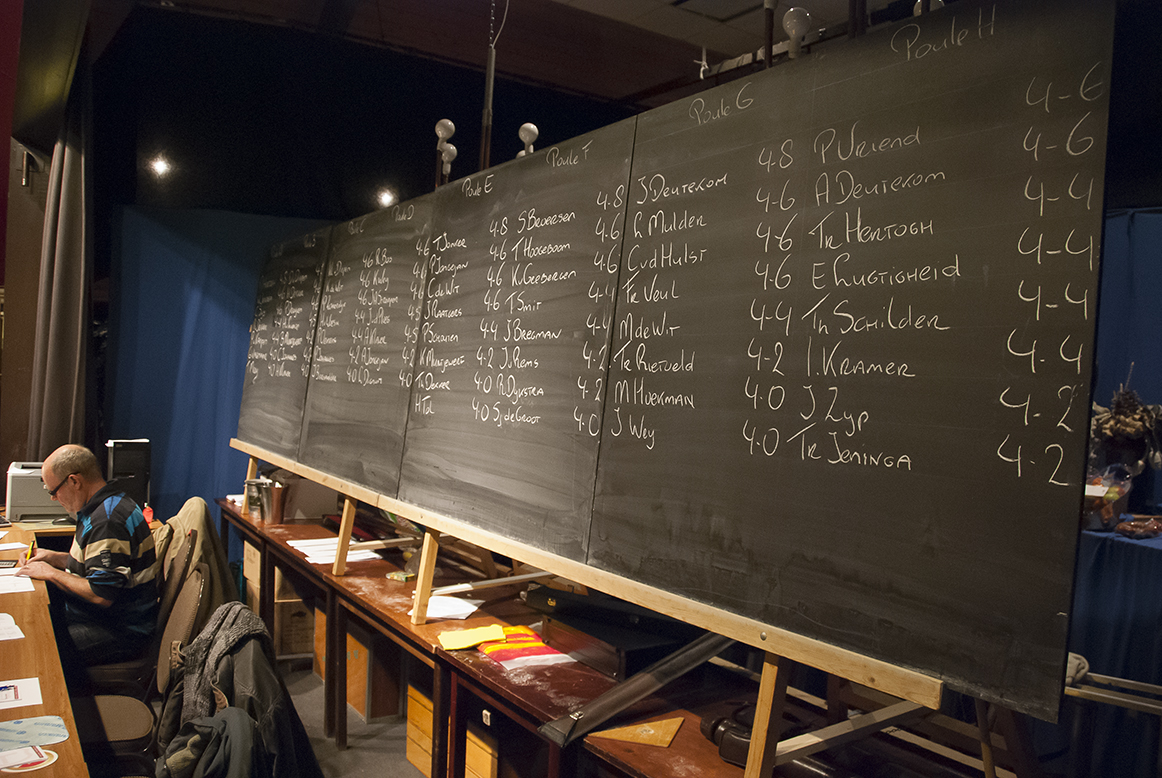 Na loting, verricht door Annie Molenaar-Bregman, kwamen vervolgens de volgende halve finales uit de bus. Bij de junioren: Kees de Wit (30) tegen Perry Vriend (17) en Dirk van Diepen (37) tegen Lenie Mulder (19). En bij de senioren: Gerard Rietveld (50) tegen Ferry van Vegten (23) en Gert de Moel (17) tegen Arie van Loon (37). Allen, met uitzondering van Lenie, woonachtig in ’t Zand en tussen de haakjes het aantal te maken caramboles.