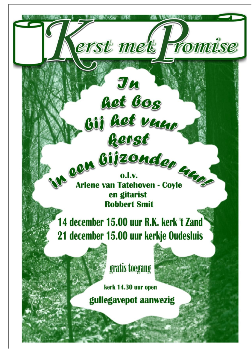 Koor Promise uit ’t Zand nodigt u uit voor hun bijzondere kerstconcert onder de artistieke leiding van Arlene van Tatenhove-Coyle en gitarist Robbert Smit. Kerst met Promise: In ’t bos bij het vuur, kerst in een bijzonder uur.