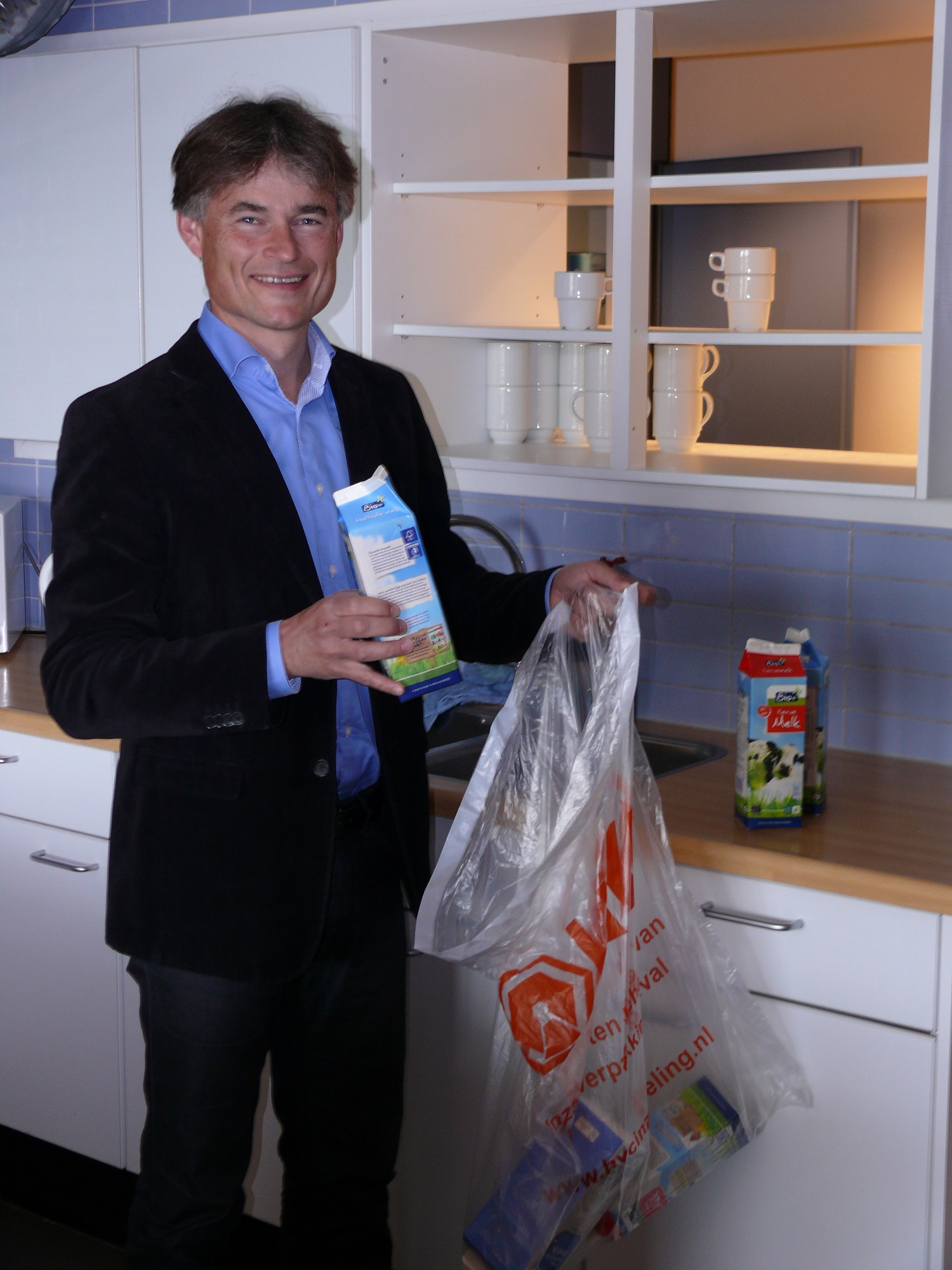 Wethouder Sigge van der Veek gooit ook zijn melkpakken in de zak voor plastic verpakkingsafval.