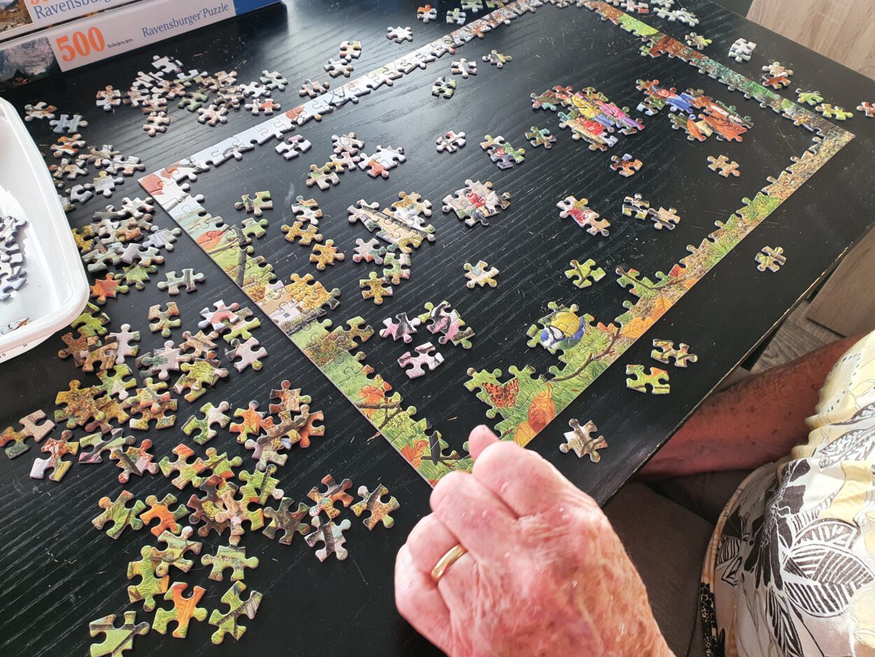 Ze neemt me mee naar haar slaapkamer waar ze een puzzel heeft liggen waar alle stukjes enorm veel op elkaar lijken. “Deze puzzel heb ik laatst samen met mijn dochter gemaakt”, vertelt mevrouw, “En nu ben ik weer opnieuw begonnen, “er staan paarden op en ik ben gek op paarden”.