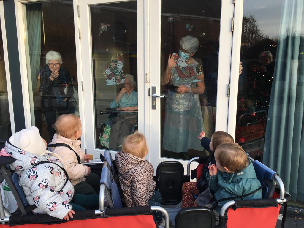 Gadegeslagen vanachter de ramen door de bewoners waar we natuurlijk even flink naar gezwaaid hebben. Een mooi alternatief nu we niet binnen op bezoek kunnen komen.
