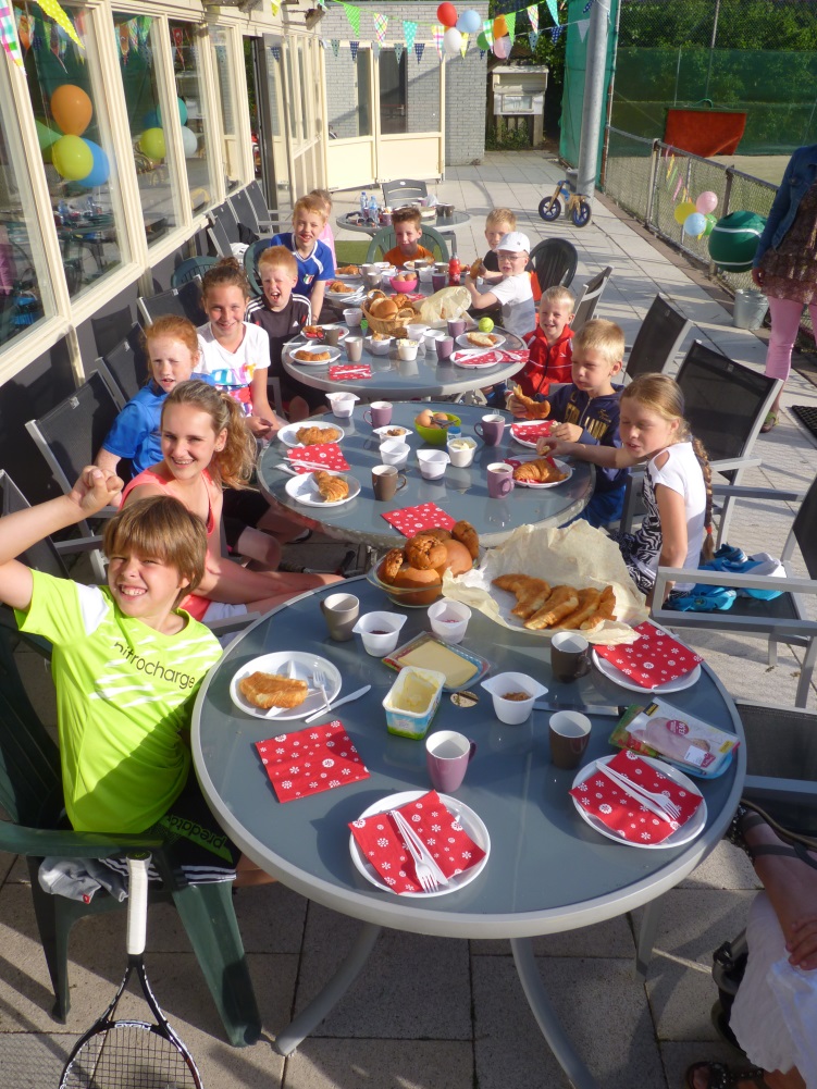 Om 8.00 uur gingen de deelnemers gezellig met z`n allen ontbijten, lekker buiten op het terras in het zonnetje. Dit jaar was het Luilaktoernooi extra feestelijk, want Mariette Nierop geeft al 12,5 jaar tennisles aan jong en oud bij T.V. ’t Zand. De kinderen hadden allemaal een hoedje op en een toeter in hun mond en hebben hard gezongen voor Mariette. Tennisvereniging ’t Zand bedankt Mariette voor de 12,5 jaar dat ze tennisles geeft bij de club en hopen dan ook dat ze nog lang tennisles blijft geven.