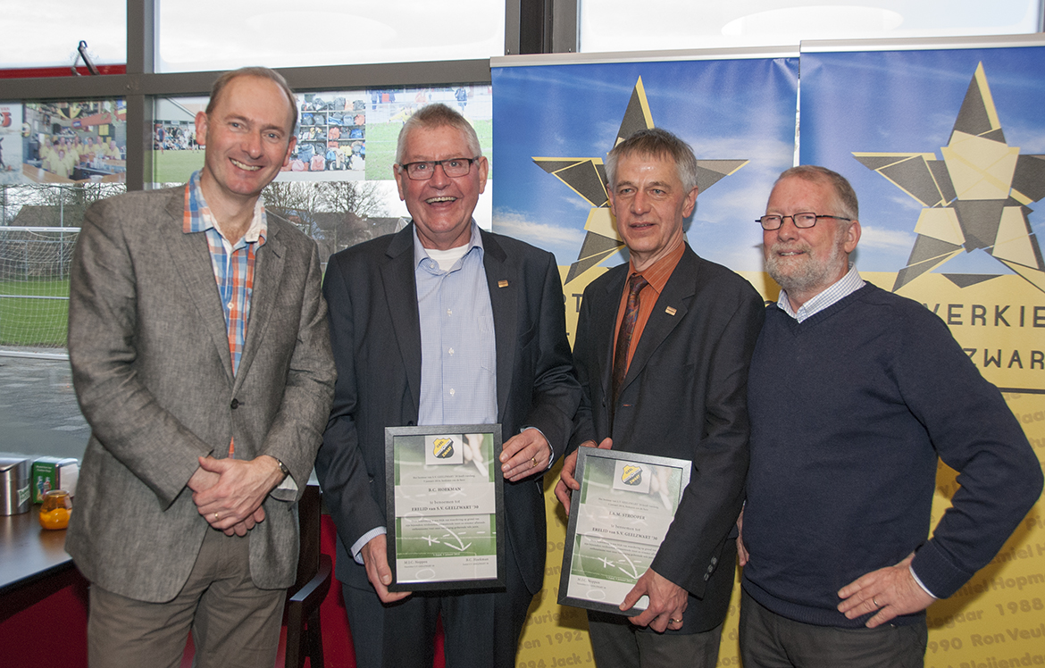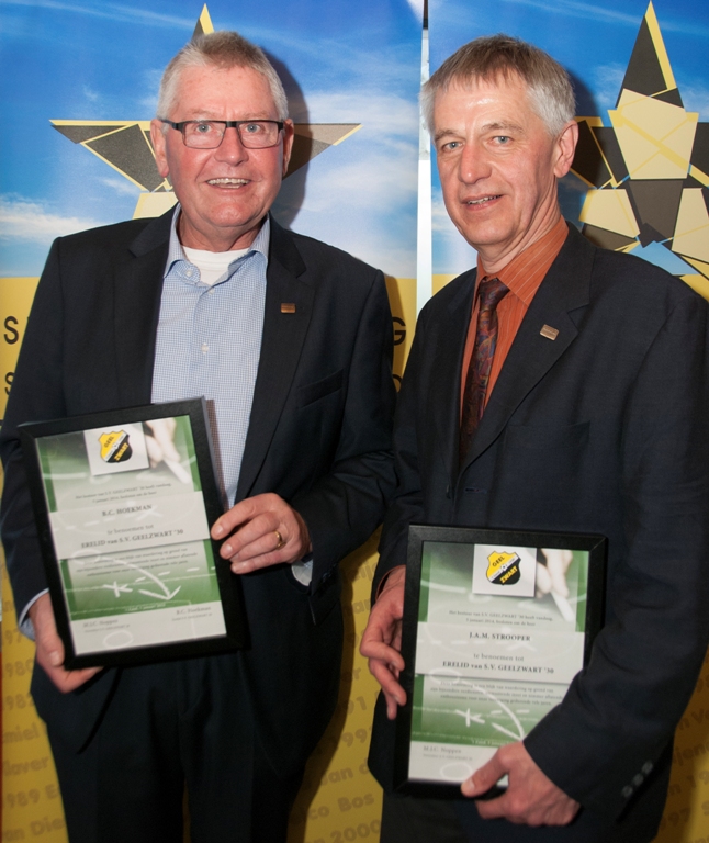 benoemd. Allereerst werd Bart Hoekman naar voren geroepen. Hij zit sinds 1992 in het hoofdbestuur en is daarmee het langst zittende hoofdbestuurslid. Verder regelt hij al jaren de Nieuwjaarswedstrijd en receptie, is scheidsrechter, zit al 21 jaar in het wielercomite en regelt het oud papier voor de vereniging. Voorzitter Marcel Noppen noemde Bart Hoekman de ogen en oren van het bestuur en de wandelen database voor prille bestuurders. Het tweede erelid is Jan-Arie Strooper. Hij is de langst zittende voorzitter van de jeugdcommissie en is jarenlang afgezant van de jeugd in het hoofdbestuur geweest. Verder is Jan-Arie Strooper organisator van de sportverkiezing, het minitoernooi, het schoolvoetbal en andere toernooien en jeugddagen. Beide Geel-Zwarters in hart en nieren kregen de bijbehorende erelidspeld, een oorkonde, een mooie bos bloemen en een langdurig applaus. Gelukkig voor de vereniging blijven beide heren zich inzetten voor de vereniging.