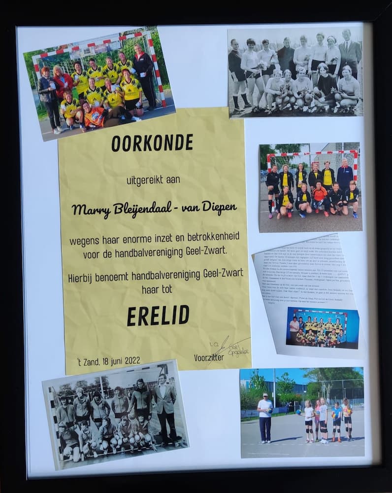 Tijdens de feestavond van het jubileum 75 (+2) jaar van handbalvereniging Geel-Zwart werd een speciaal iemand extra in het zonnetje gezet, Marry Bleijendaal werd tot haar grote verrassing benoemd tot Erelid van handbalvereniging Geel-Zwart!