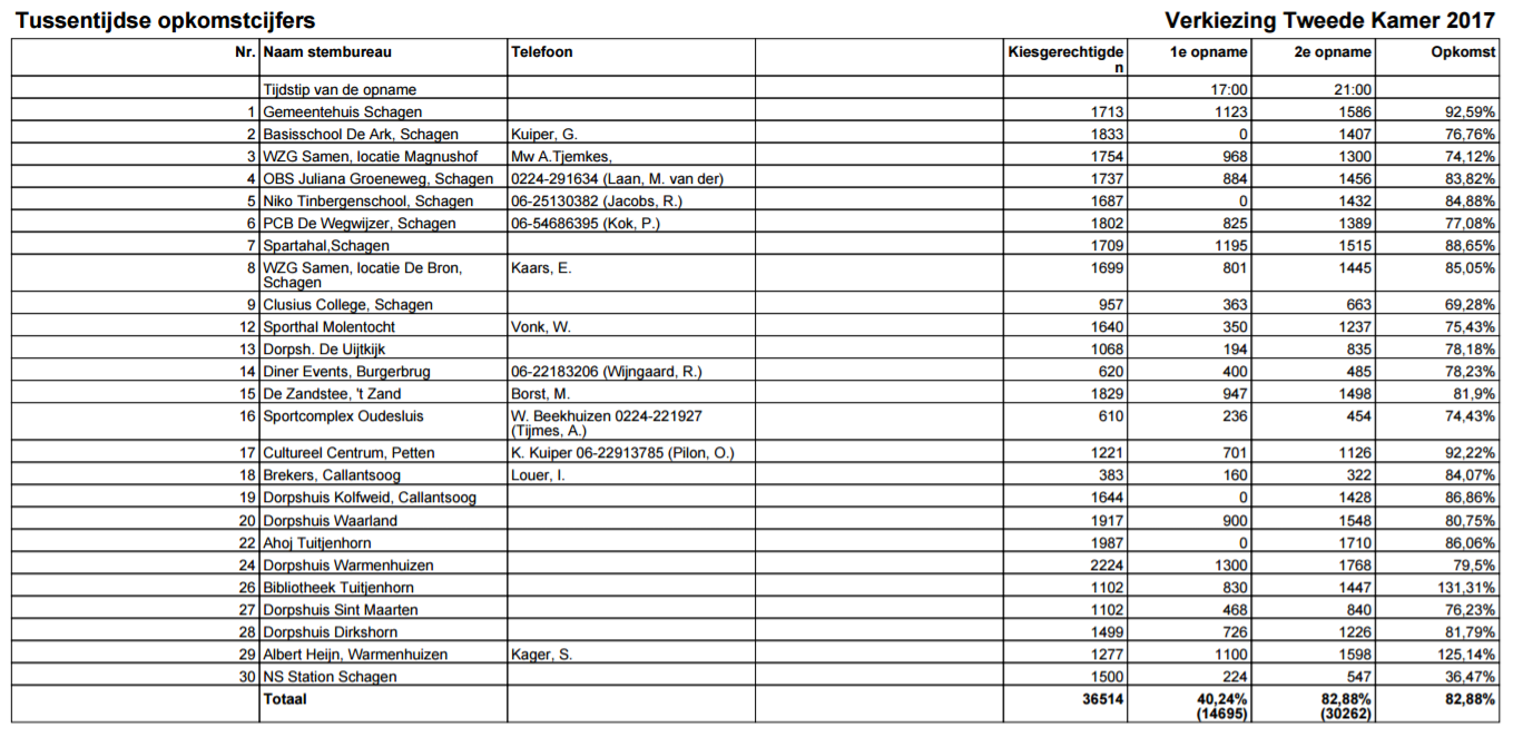 De opkomst in de gemeente Schagen was 82,88%. Stembureaus waar de opkomst meer dan 100% was, waren het stembureau in de bibliotheek in Tuitjenhorn (131,31%) en het stembureau in de Albert Heijn in Warmenhuizen (125,14%).
