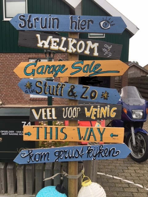van ontspullen, verhuizen en opnieuw beginnen boden wij zelf onze waar aan. Geen ouwe meuk, alleen goede, bruikbare en nette spullen waarvan ik moeilijk over het hart kon verkrijgen om ze zomaar weg te doen. Aan ons adres was het niet zo’n succes. Een klein aantal bezoekers welke mondjesmaat wat afnamen. De koopjesjager die ruim voor aanvang kwamen en €4,- voor een puntgaaf en brocante suiker en melkset te duur vonden. Kwam ik uit pure principe gewoonweg niet tegemoet. Niet nu al, nu we officieel nog niet geopend waren. We zagen ze aan het eind ook niet meer terug toen we alles voor 1,- te koop zette. Amper ook gesprekken met wildvreemde mensen welke juist zo leuk zijn bij zulke gelegenheden. Nee, vooral nors kijkende speurders.