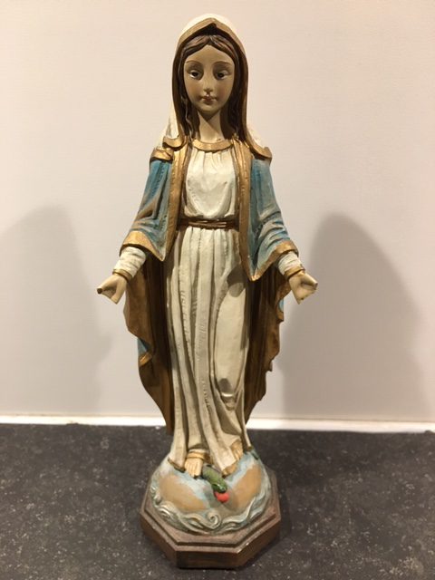 met waar stonden. Het ging over het heiligbeeldje welke ik prachtig vond. Oud, klein, beschadigd, een allerliefst gezicht en ……..zonder handen. Ik raakte in een bijzondere conversatie om tot een mooi bedrag te komen met de man met gemillimeterd ultra wit geblondeerd haar met klein kuifje wat uit zijn voorhoofd leek getrokken. “Ze mist haar vingers!!” “Ja, ze heeft een gat in haar hand” “Waar zou ze haar geld aan uit gegeven hebben?” “Geen idee, die malle doek om haar lijf zal niet veel gekost hebben”. En zo verder om tot de slotvraag te komen. “Maar wat moet ie kosten? ik heb geen gat in mijn hand” “Maria” noemde we haar voor het gemak, “mist wel haar vingers dus veel kan het niet wezen. Of je moet ze hier nog ergens tussen hebben liggen, plakken we ze er weer aan”. De man met witte kuif en zijn partner in rood geruite tuinbroek kwamen tot de hilarische conclusie dat €1,50 een mooie prijs was. Al was het alleen maar voor het gesprek welke zeker een kwartier had geduurd. En het papiertje wat er om haar heen gewikkeld werd. Tis 1 Van de weinige ouwe meuk welke ik nog in huis heb.