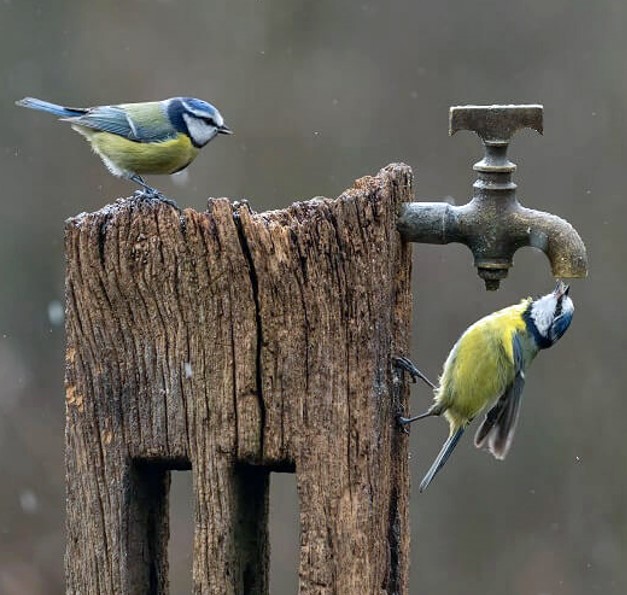Op de foto te zien pimpelt deze mees gewoon aan de kraan.