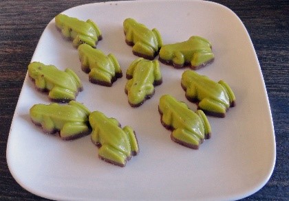 Een zakje chocolade kikkertjes. Ze hebben dezelfde kleur en zijn even groot als die op het natte straatje. Alleen, ze springen niet en zijn heel erg lekker.