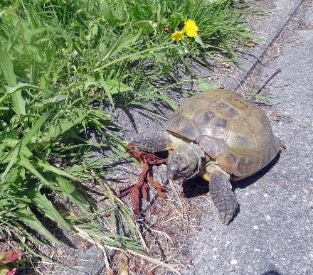 Visite achter onze huizen, er loopt een schildpad rustig te kuieren, af en toe werkt hij ook nog wat naar