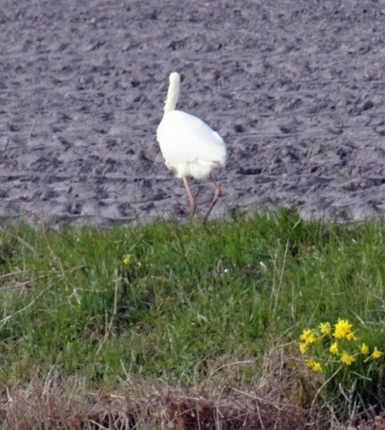 We hebben al enige tijd een gast achter ons huis, een witte reiger ofwel zilverreiger. Hij stapt door het water of is op het akkerland te vinden.