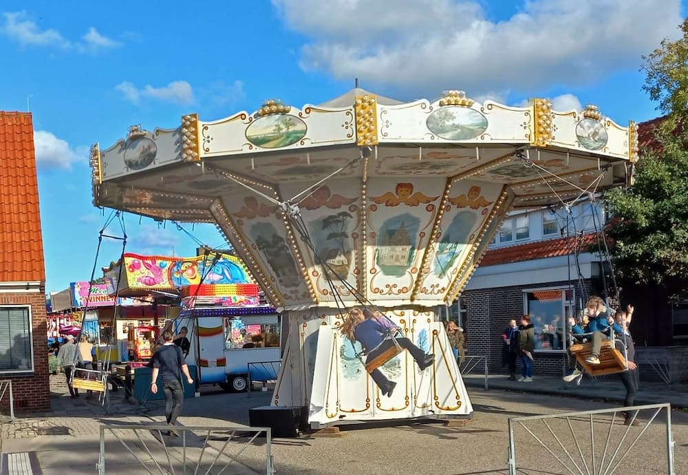 De kermis beleeft hoogtijdagen, vooral door een zonnige zondag. De attracties deden goede zaken en die goede oude zweef was weer geliefd bij jong en oud, af en toe die zwieper geeft de grootste lol.