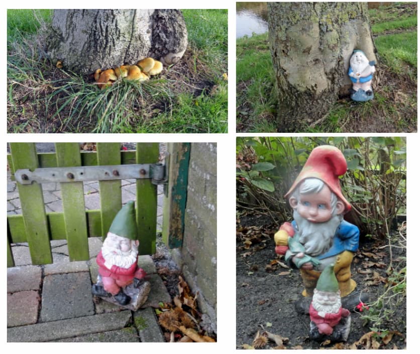 Op mijn wandeling kwam ik eerst paddenstoelen tegen, heel gewoon om deze tijd. Daarna stond er ineens een kabouter onder een boom. Vriendelijk zei hij met een klein stemmetje: “Aan de loop meneer? Houdt vol hé”.